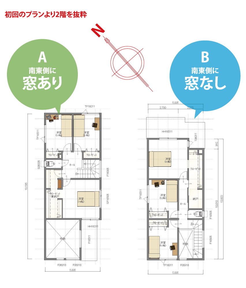 S様の希望である<大きな吹き抜け><自然光が入る明るい家>と考えると、南東側に窓のあるプランの方が本来のご希望を叶えられていますよね?