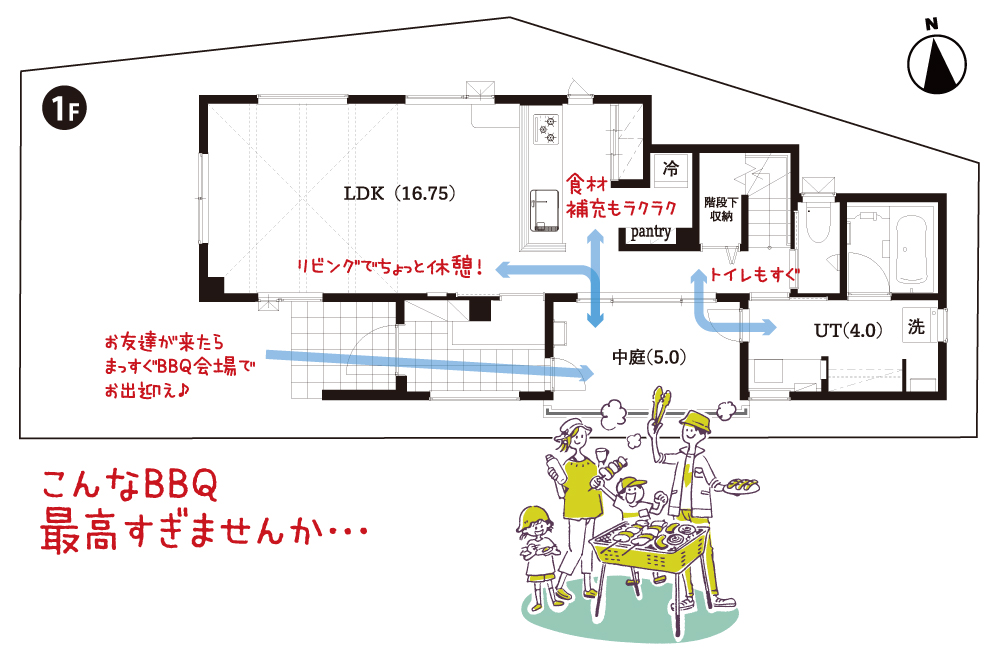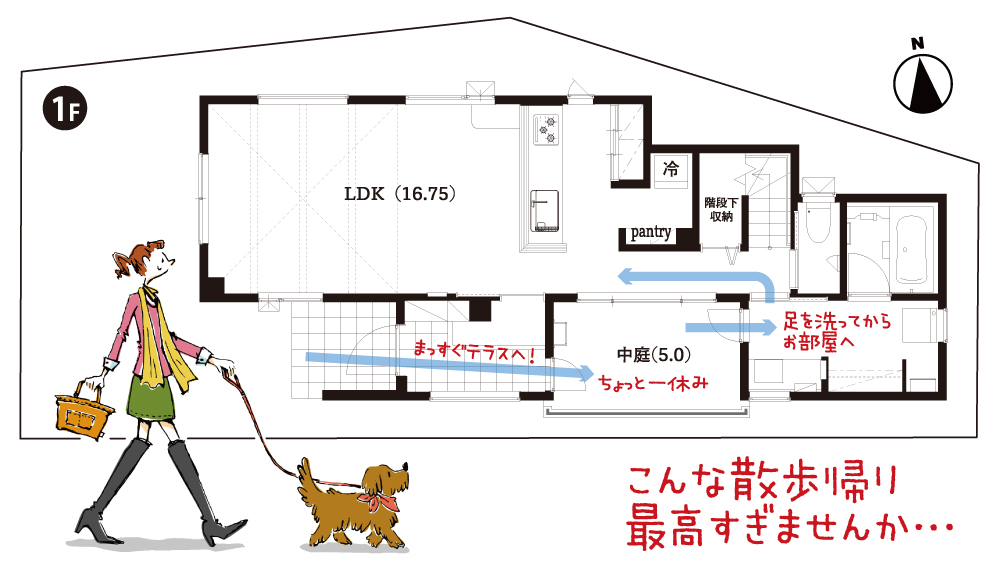 ちなみにこの時、中庭に続く動線についてもご希望が出たので、T様は中庭のある暮らしのイメージができていた、そして優先順位も高かった。