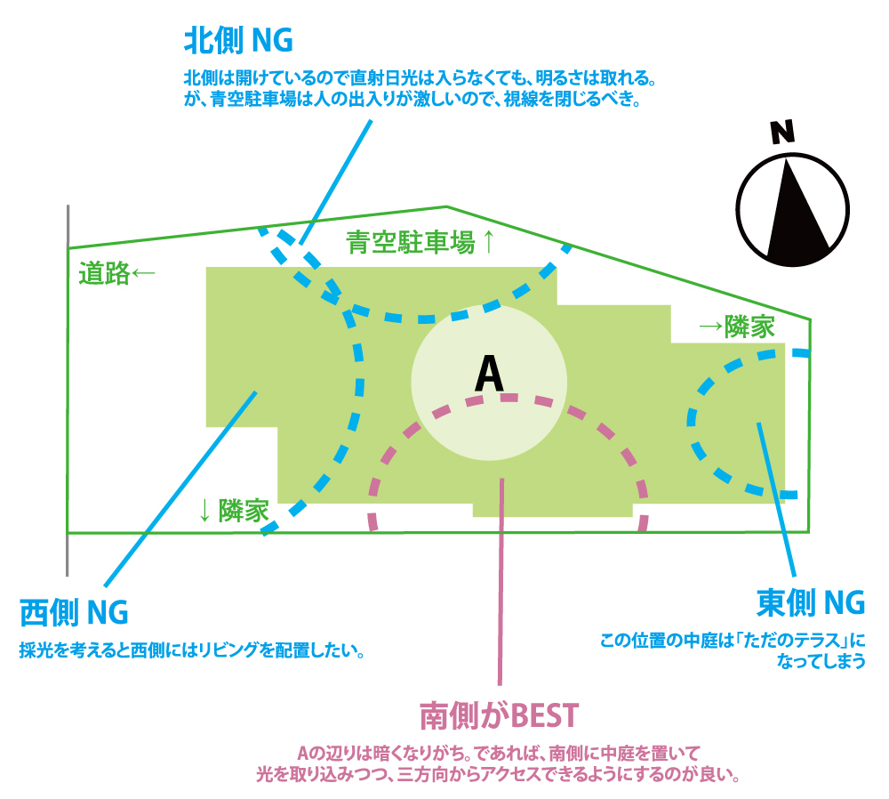③残るは南側。ここに中庭を置き、光を建物の中まで取り込める仕掛けを作るのがBEST!