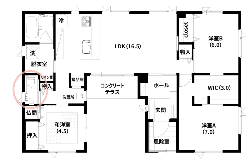 M様は、トイレを洋室や洗面所などの水廻りが集まる箇所に設置しました。