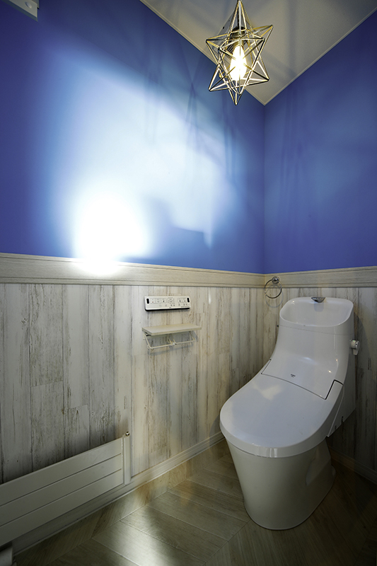 ニュアンスの異なるブルーとマリンランプの演出により、海を感じられる室内になっています。特に水廻りのブルーは清潔感があって、とても素敵。