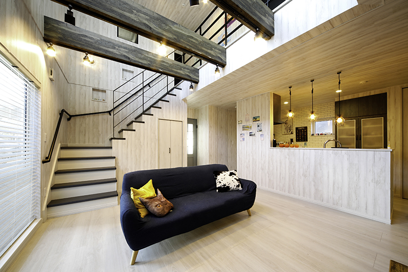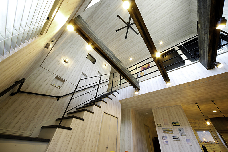 古木風のクロスをあしらった梁がアクセントとなった吹き抜け。手摺をアイアンのバータイプにしたことでより開放感のある空間になりました。