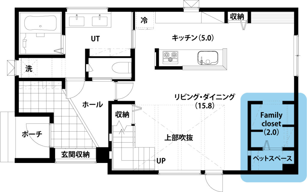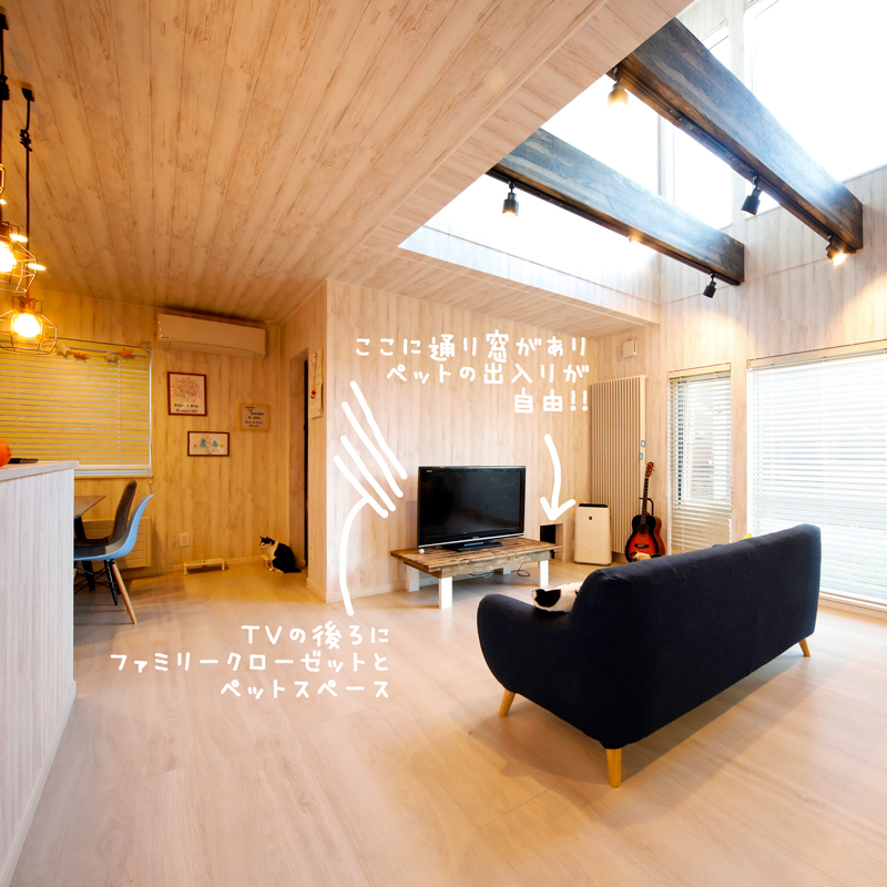 間取りを考える際、リビング横の洋室は不要と判断されたO様。その代わりに設置したのが、ファミリークローゼットとペットスペースでした。