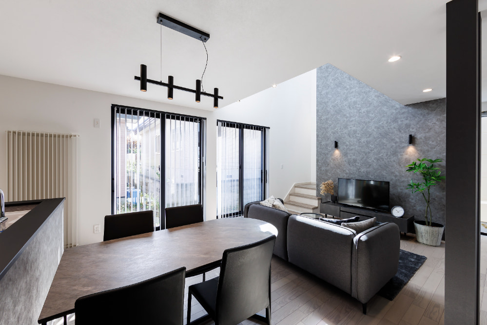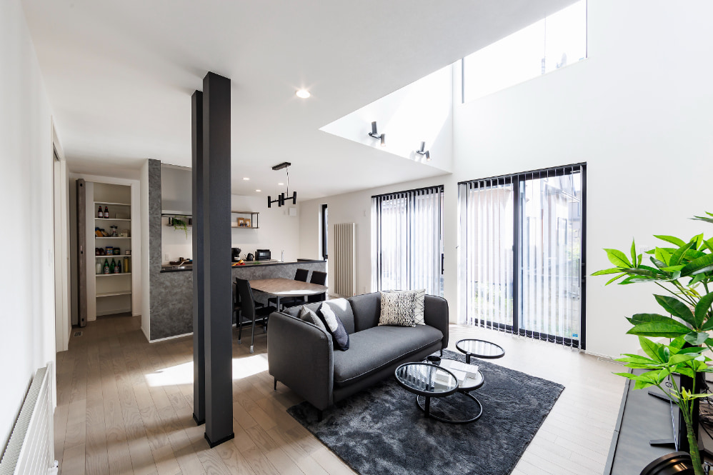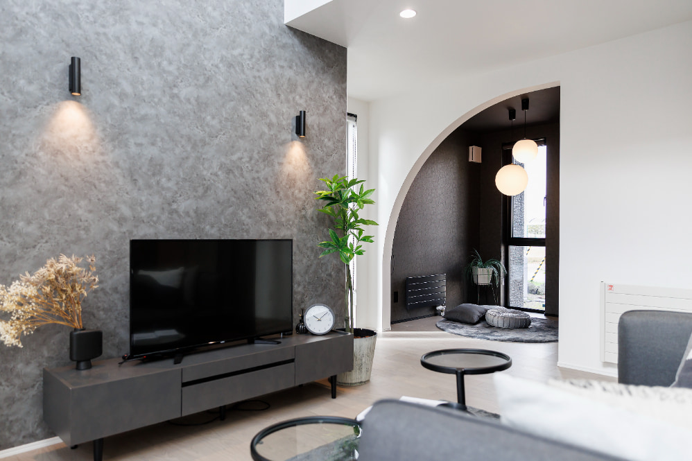 スタイリッシュな内装にアクセントを加えるR下がり壁。視覚的に楽しく、家族がつながりを感じながらも自分の時間を大切にできる空間を提供。