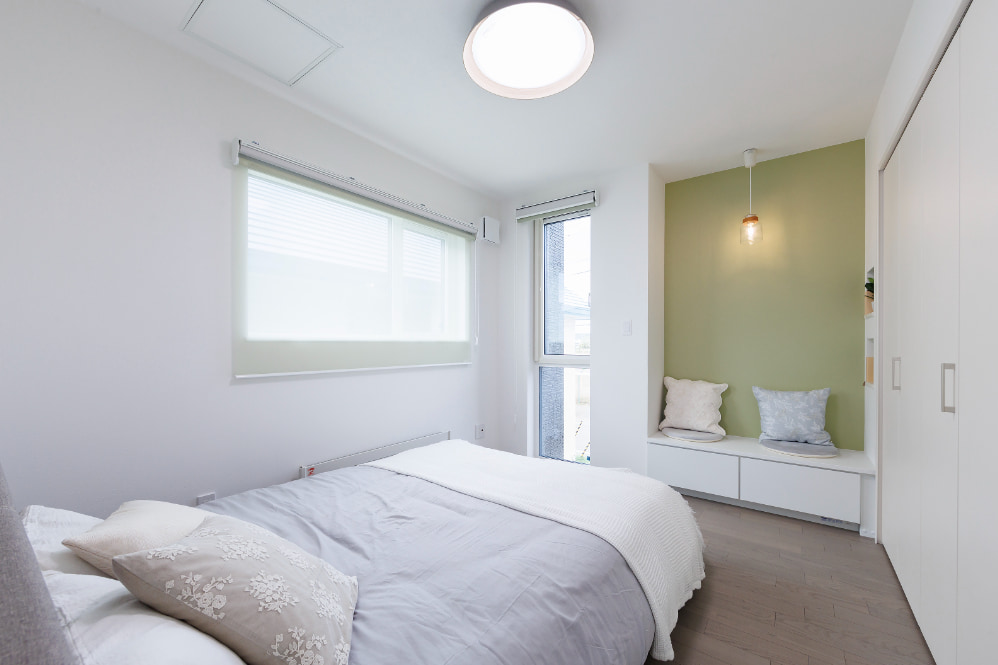 2階の寝室はグリーンをアクセントにした穏やかな空間。読書やリラックスに最適なベンチが設置され、機能性とデザイン性を両立。寝室をよりゆったりとくつろげる特別な空間に。