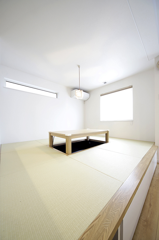 「和の要素って落ち着けるしなんかいいなぁ、と思って(笑)」とご主人。和食を中心とした居酒屋などに行くと、囲炉裏があったり、掘りごたつがある席をよく見かけ、以前からその雰囲気に憧れていたのだそうです。「ああいう空間で家族みんなでゆったり食事ができたらいいな、という思いがあって、どうしても僕がこだわりたかった部分です。毎日食事する場所になるので、掃除しやすいようにビニール畳を採用したり、足元が冷えないように暖房の入り方も工夫しました。和のテイストということで、ちょっと特別な空間ではあるのですが、キッチンやリビングと続く場所なので、壁の色や窓の配置など、1階全体での統一感が出るようにしています。こだわっただけあってお気に入りのスペースです」。