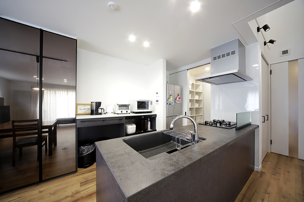 そのお言葉どおり、”キッチン自体がインテリア”といっても過言ではない、スタイリッシュなデザインのアイランドキッチンを配置。後ろにある同色のスライディングストッカーとの組み合わせも抜群で、初めて拝見した私たちも一目で、そのこだわりがひしひしと伝わってきました。