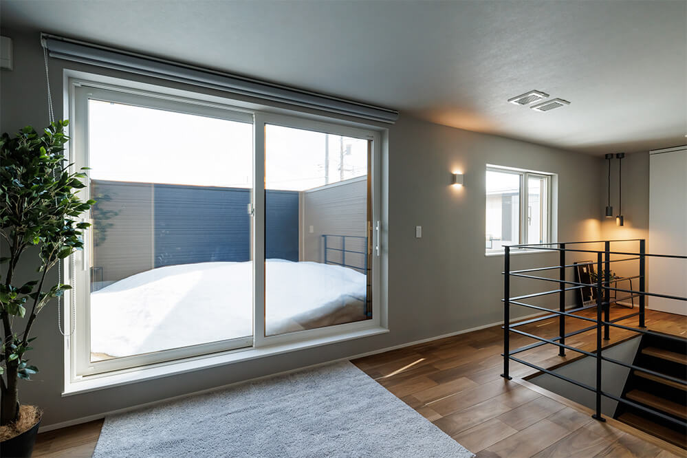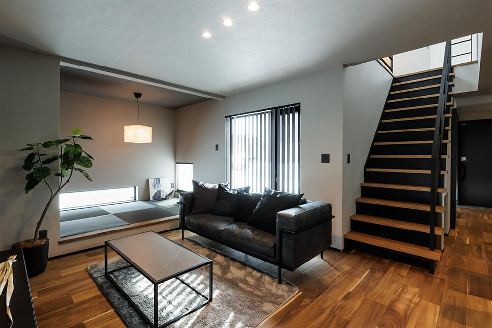 モダンスタイルと和のエッセンスを掛け合わせたリビングは、家族みんなが永く愛せるくつろぎの空間に仕上げました。リビング階段の吹き抜けや、小上がりにもうけた小窓からも光が差し込むこだわりの設計です。