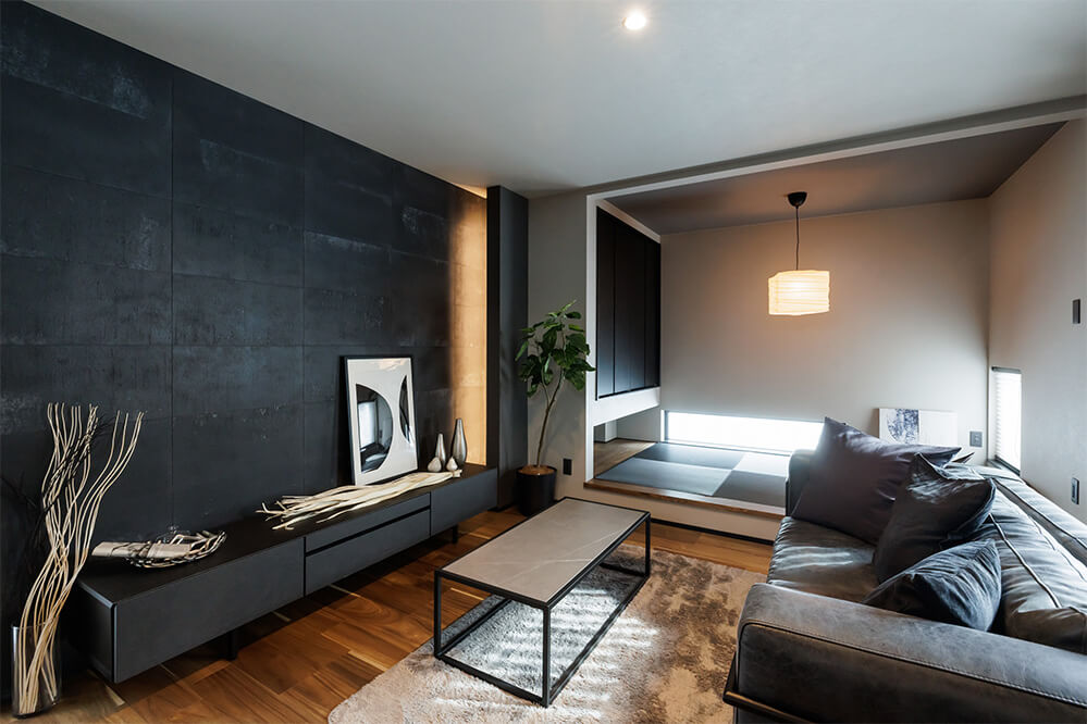 リビングにブラックの内壁をもうけることで、より洗練された空間に仕上げました。間接照明の灯りで、クールな質感の中にも温かみのある空間を演出しています。