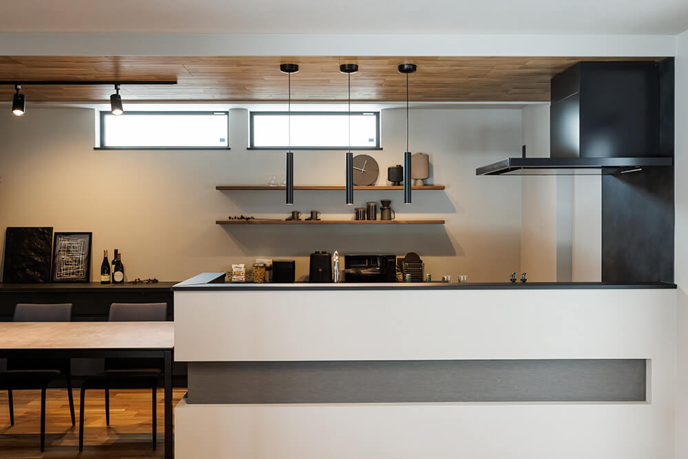 ブラックグレーでまとめたスタイリッシュなキッチンは、大容量の収納付き。高い所の収納がない分、物の出し入れが快適に行えます。