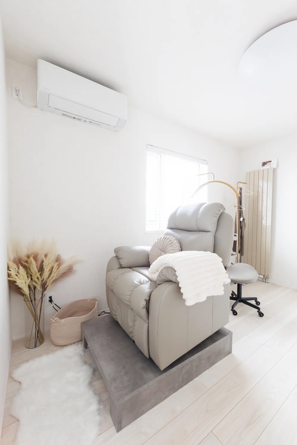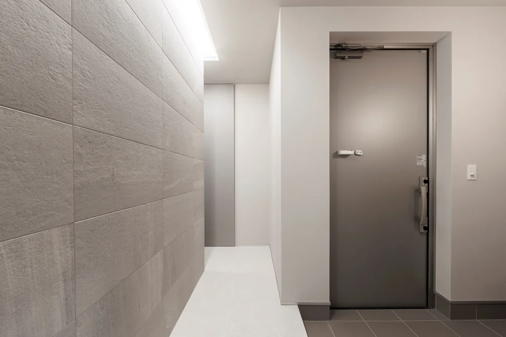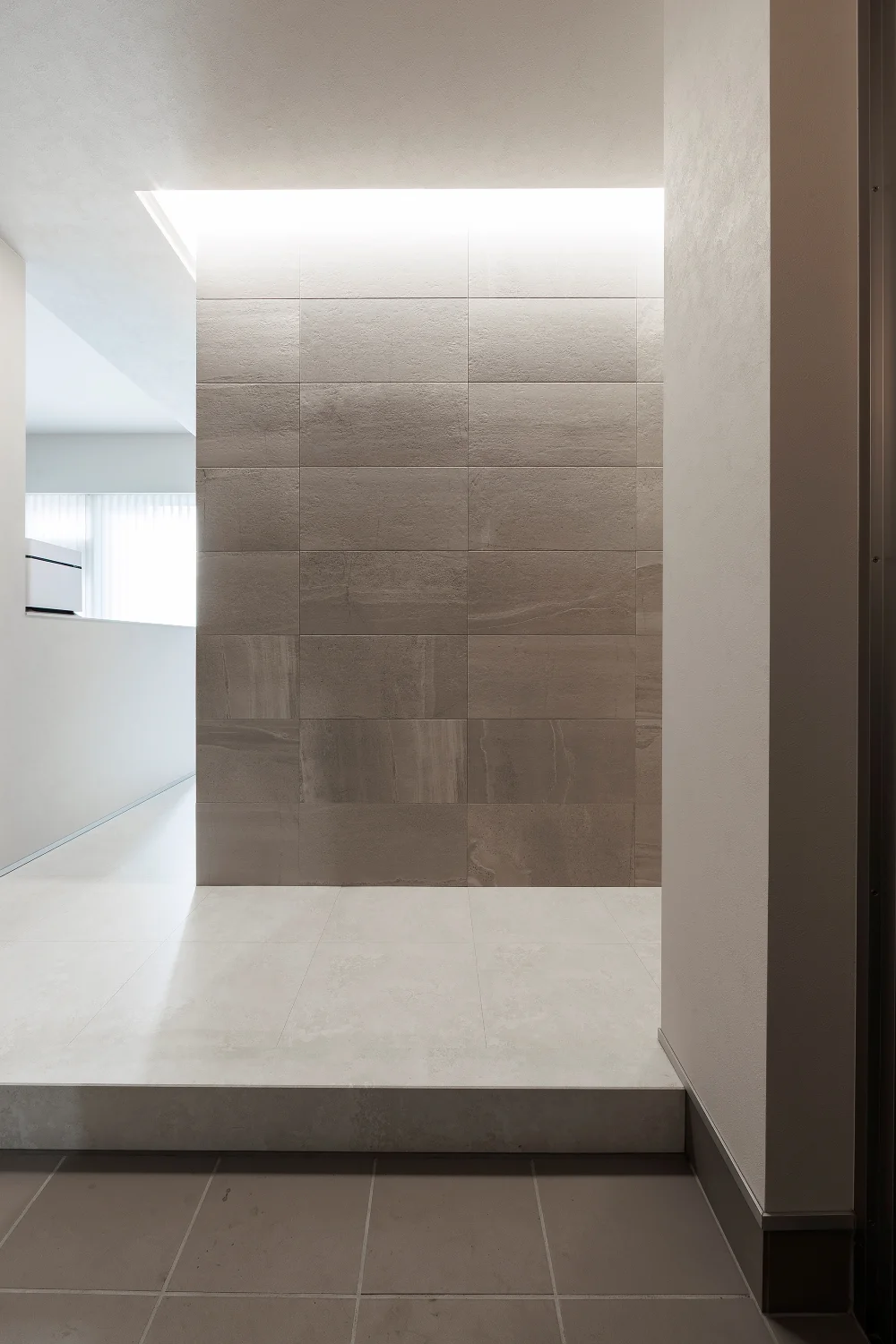 玄関の正面に配したグレーの大判タイルを、柔らかな間接照明が照らすデザイン。入った瞬間から特別感のある玄関ホールです。