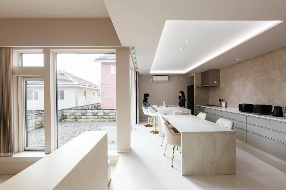 「折り上げ天井×横並びダイニング、家事もくつろぎも快適に」