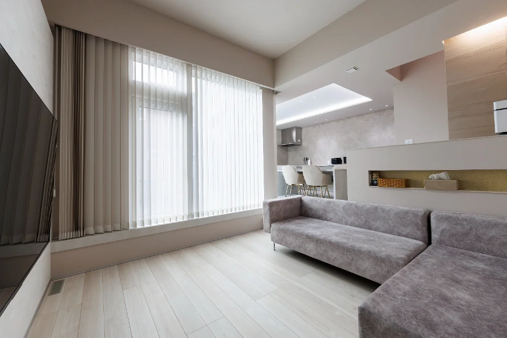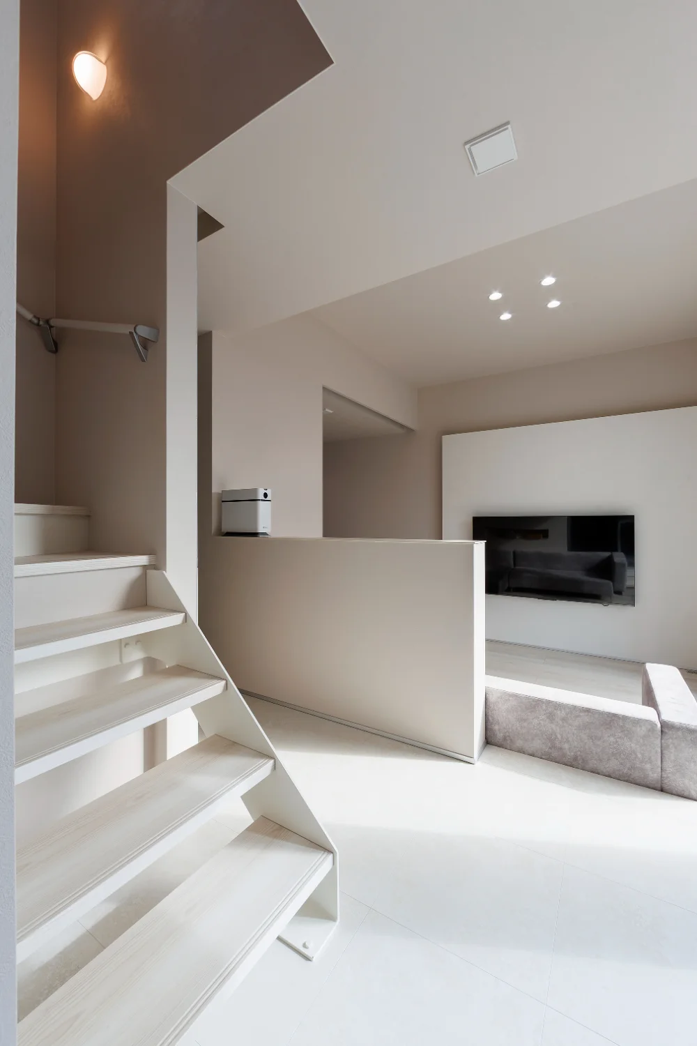 ダウンフロア×高天井×大きな窓が生み出す圧倒的な開放感のリビング。収納付きの続き間をつなげれば、さらに広がりと奥行きを感じられます。テレビ裏にはデザイン性のあるふかし壁を配し、見た目にも上質なリビングに仕上げました。