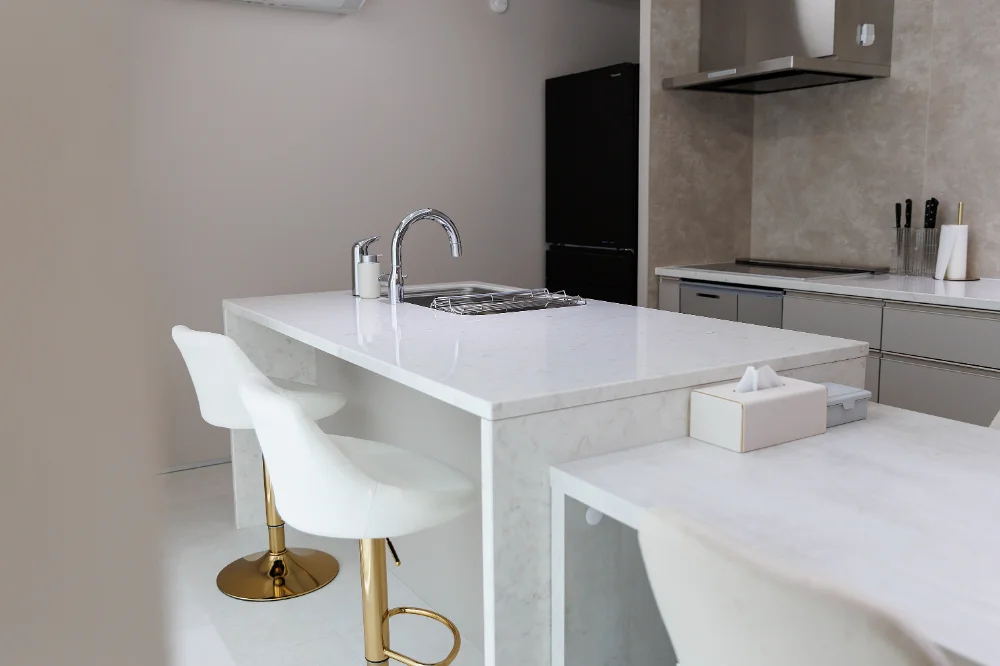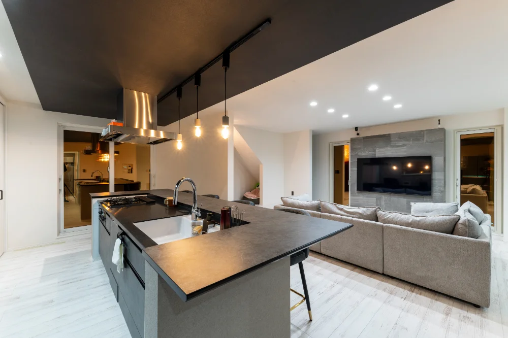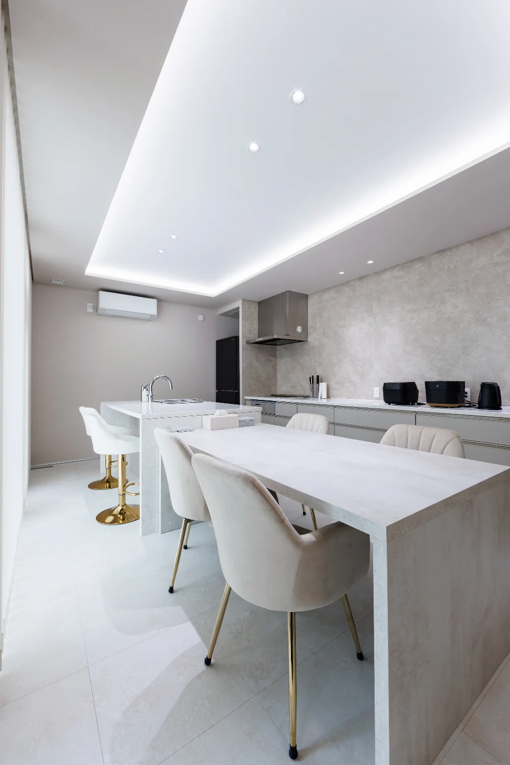 家事効率を考えた横並びダイニング。Ⅱ型キッチンと大容量背面収納で、調理も片付けも快適。折り上げ天井の間接照明が空間を美しく照らし、リビングとは分離することで、くつろぎと食事の時間を自然に分けられます。
