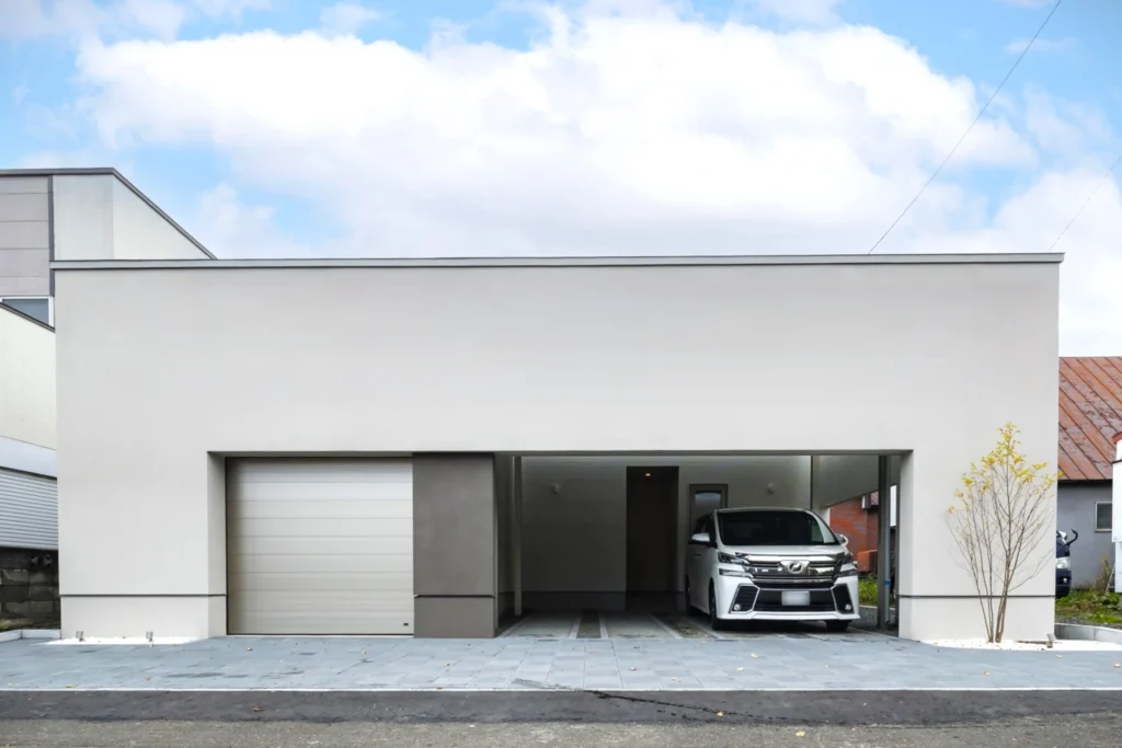 3種のグレー・ベージュの外壁に加え、塗り壁と窯業サイディングの素材の違いが印象的な佇まいを演出。大きい門構えのようなデザインが、開放感のある外観を完成させます。