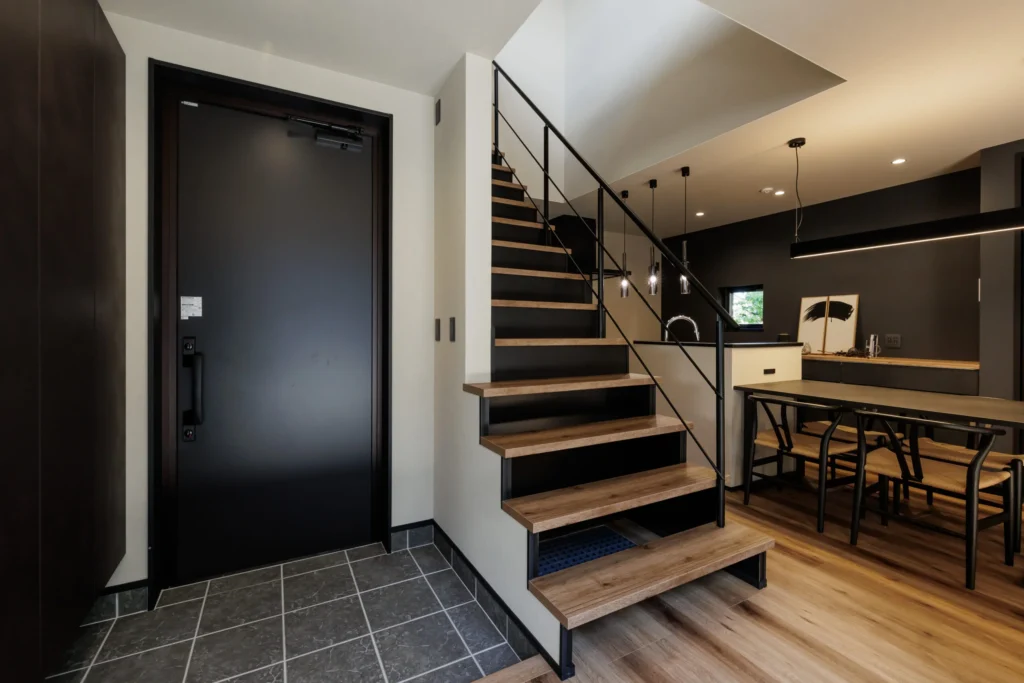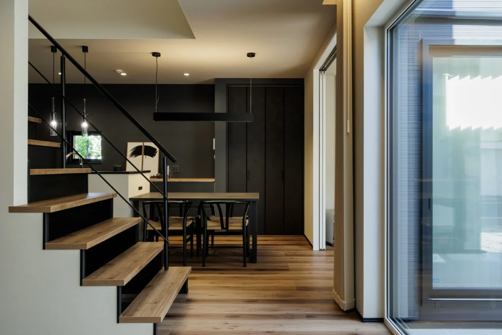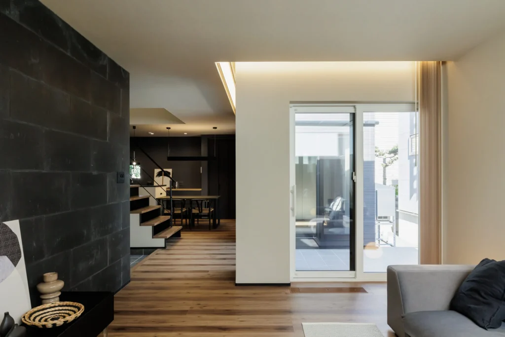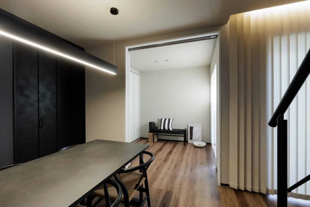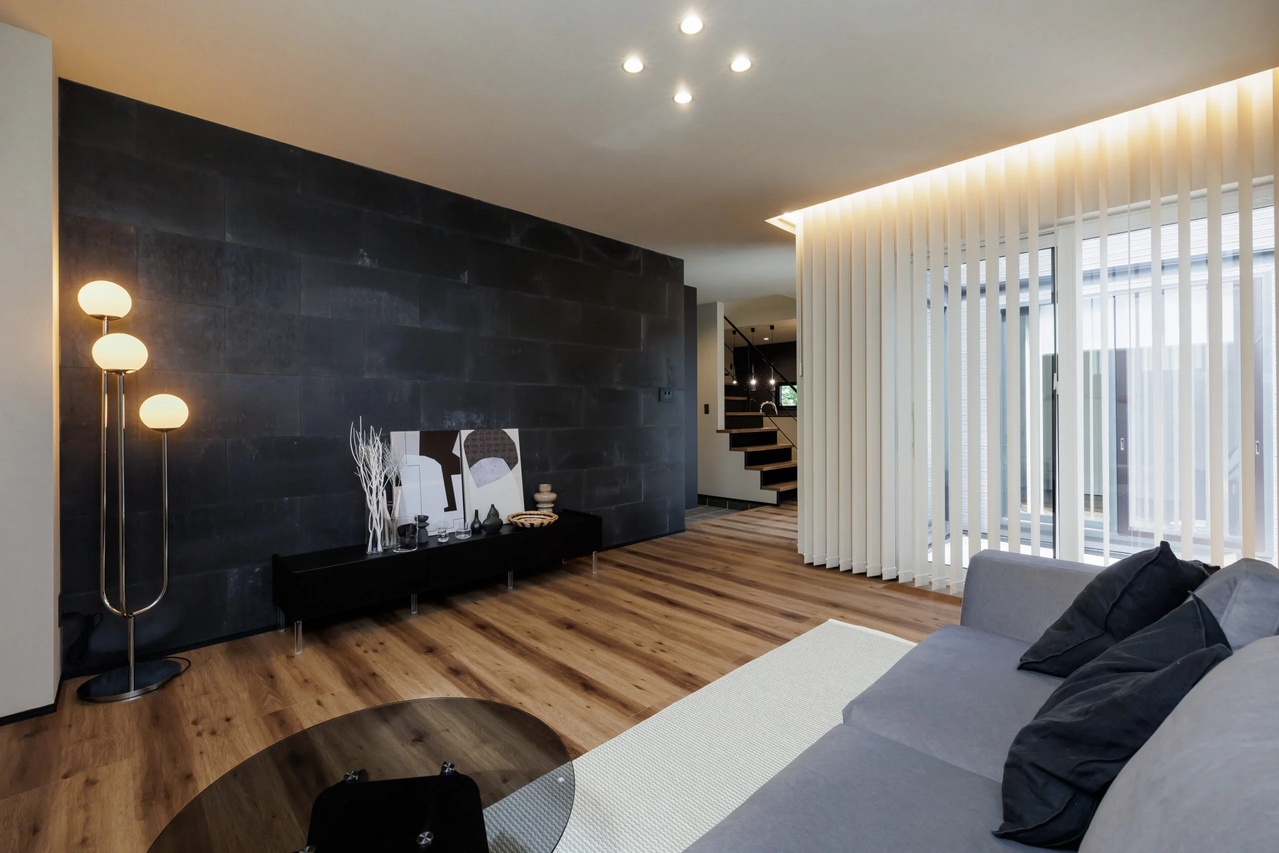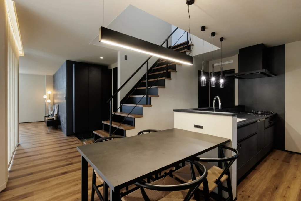 外観はブラックを基調に、陰影を際立たせる立体的なデザイン。室内はブラックとグレーを巧みに取り入れたモダンなインテリア。大人の感性を満たす統一感ある空間で、外観から内観まで一貫した美意識が感じられる住まいです。