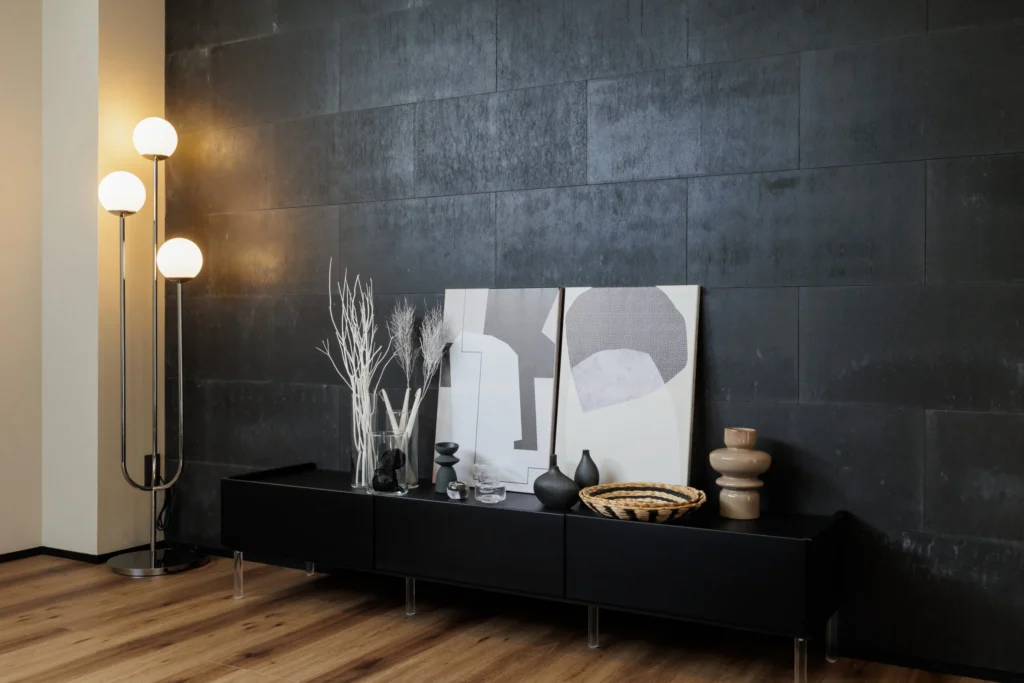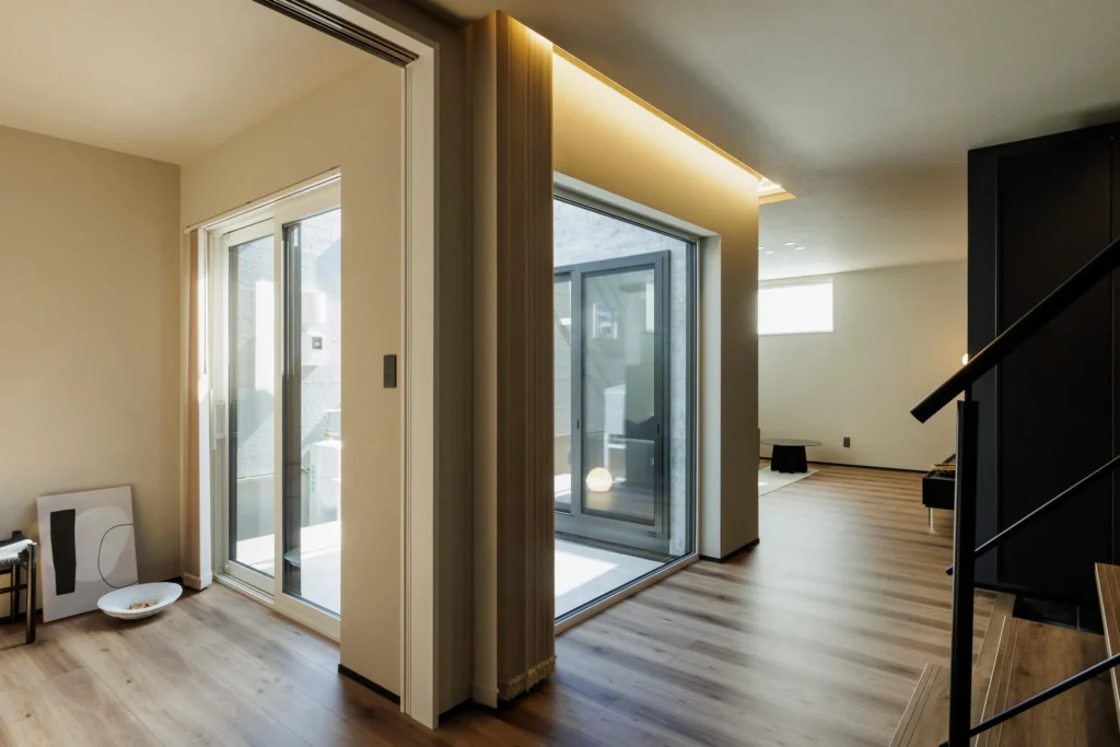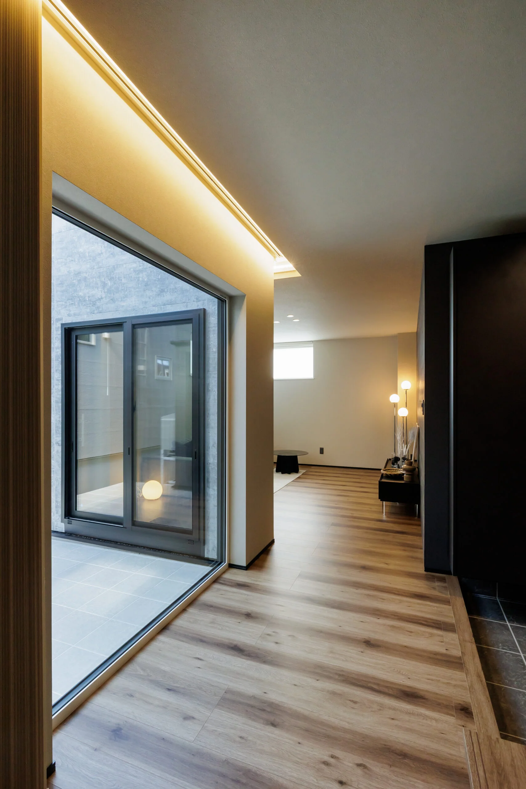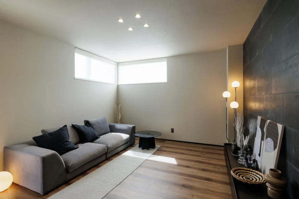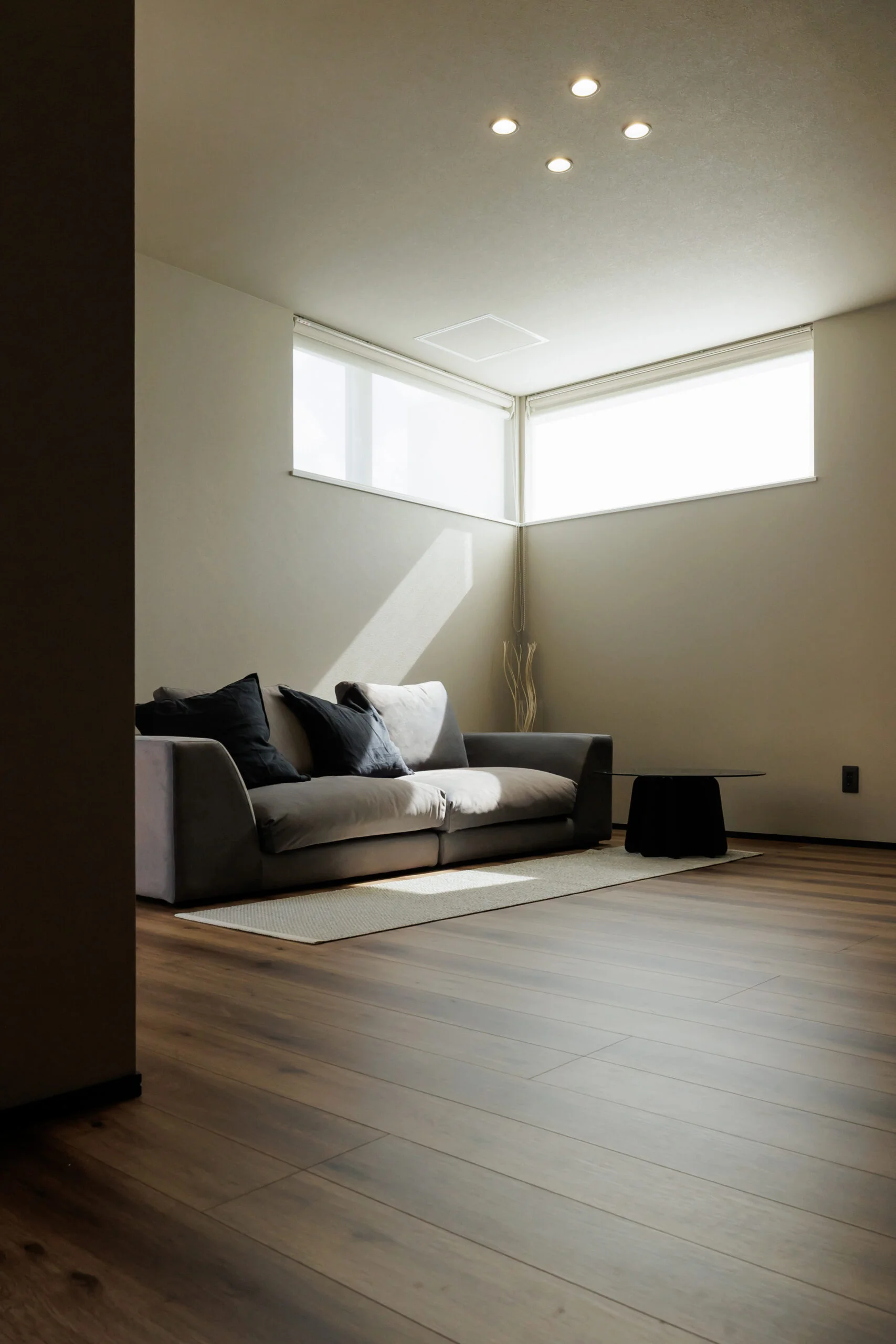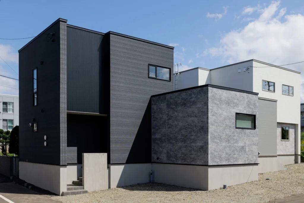 外観はブラックを基調に、陰影を際立たせる立体的なデザイン。室内はブラックとグレーを巧みに取り入れたモダンなインテリア。大人の感性を満たす統一感ある空間で、外観から内観まで一貫した美意識が感じられる住まいです。