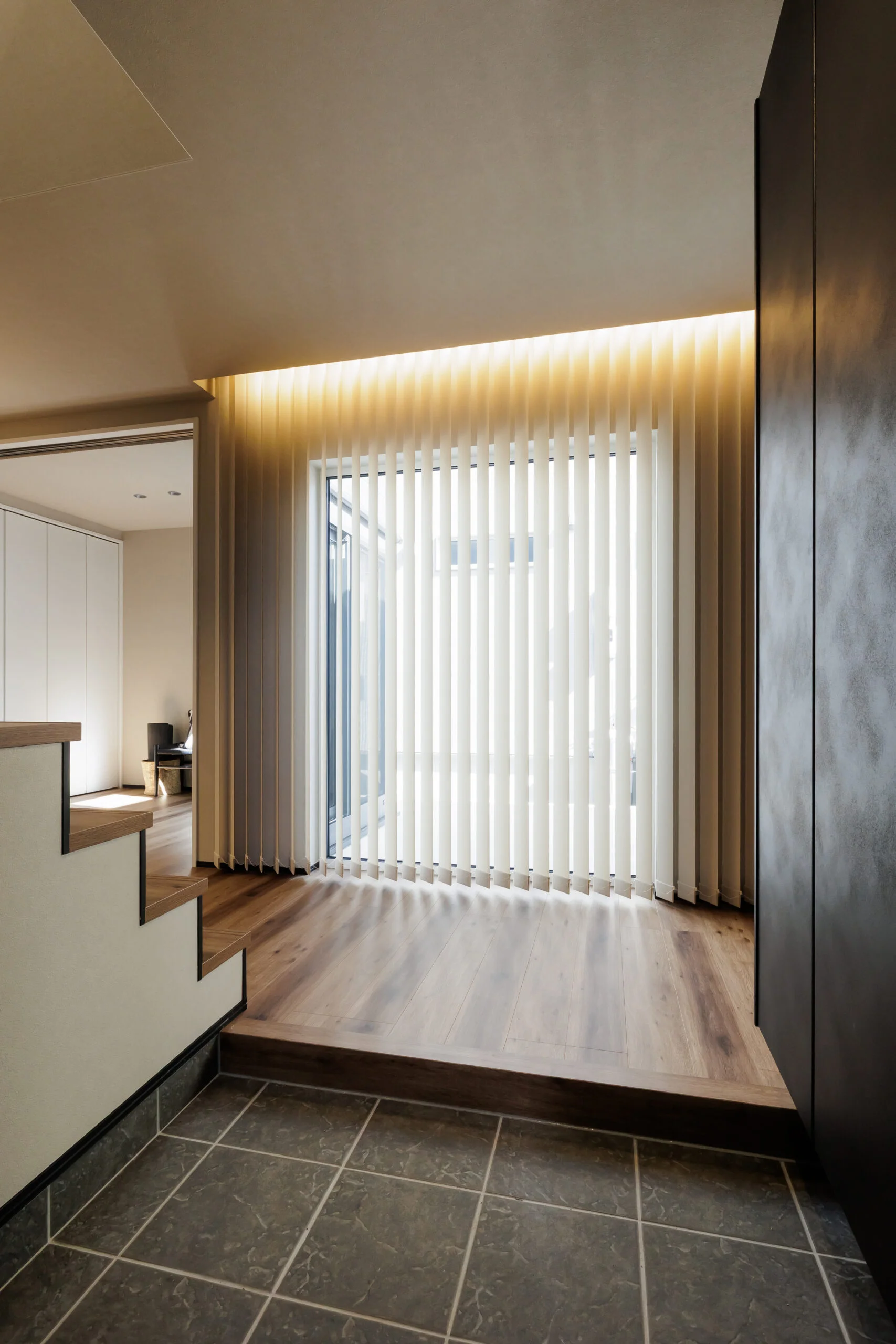 リビングドアを設けず、圧迫感のない開放的な玄関。扉を開けた正面にテラスが広がり、奥行きと開放感を感じられます。