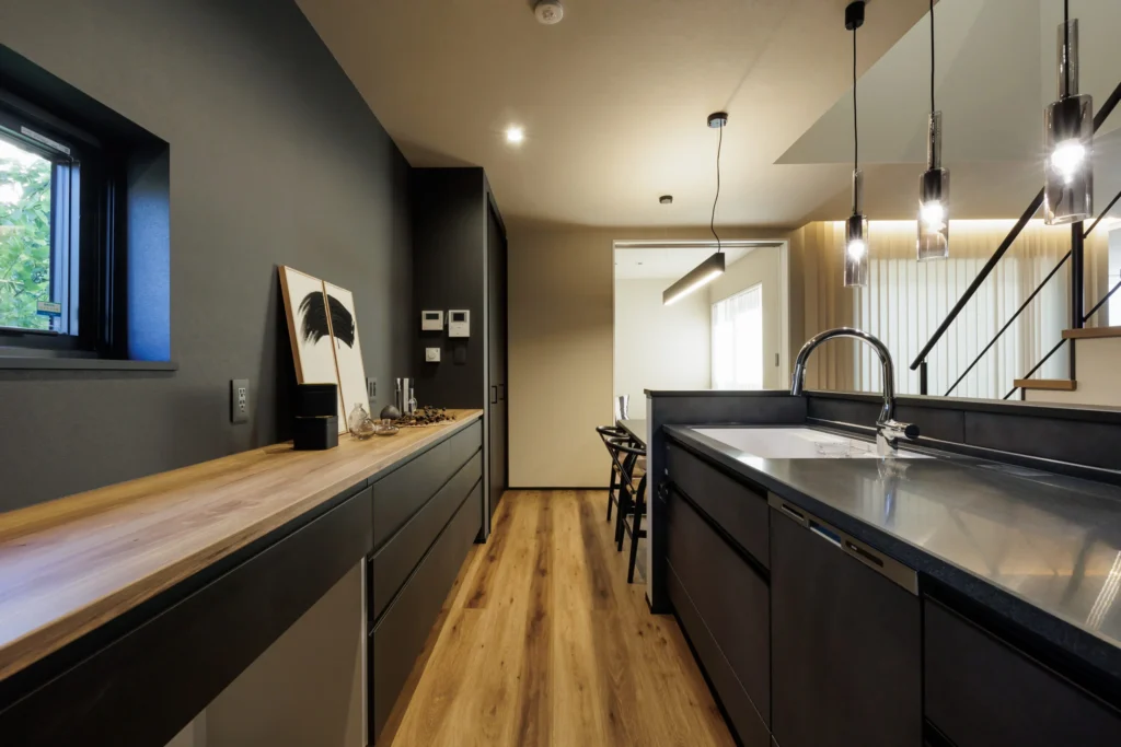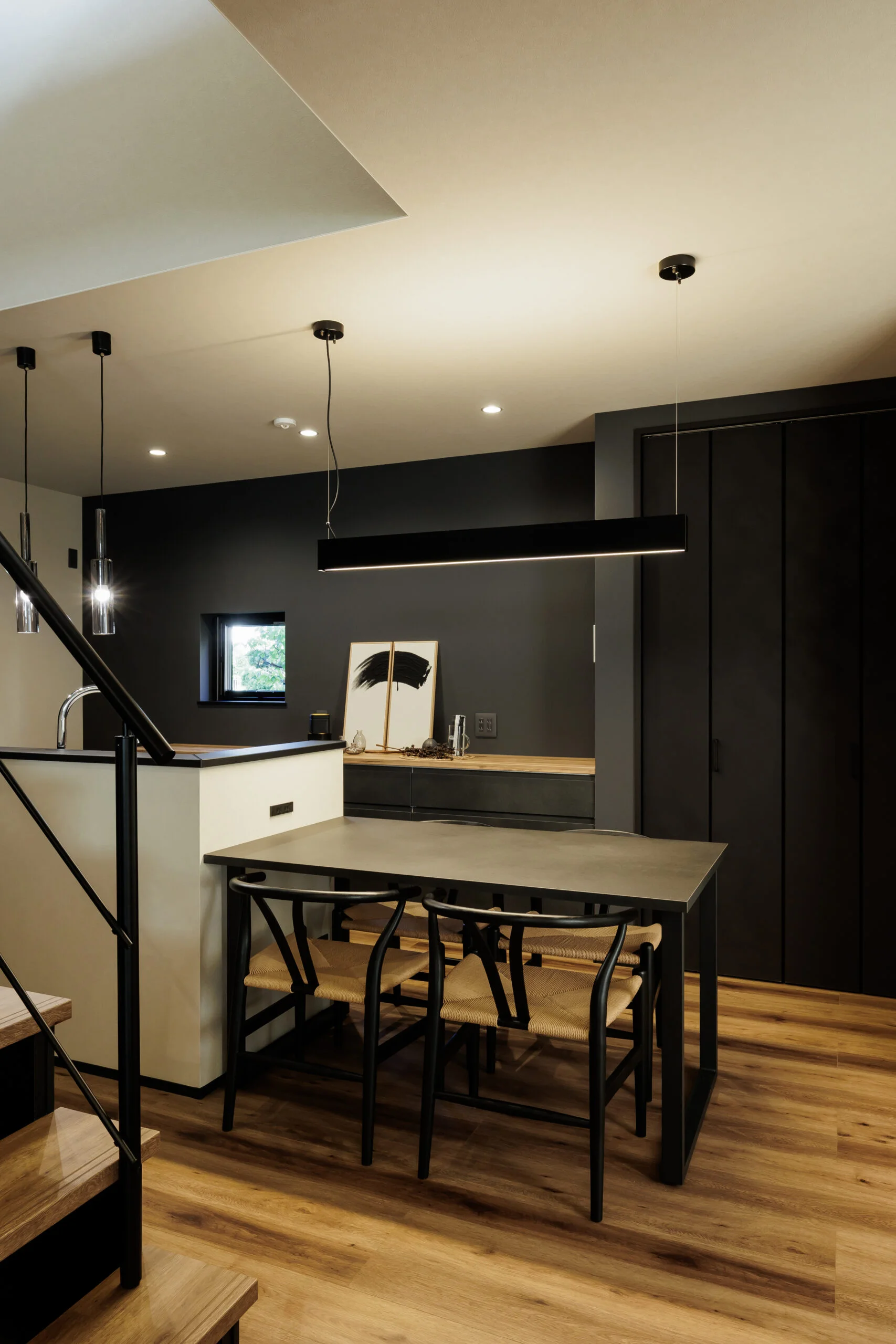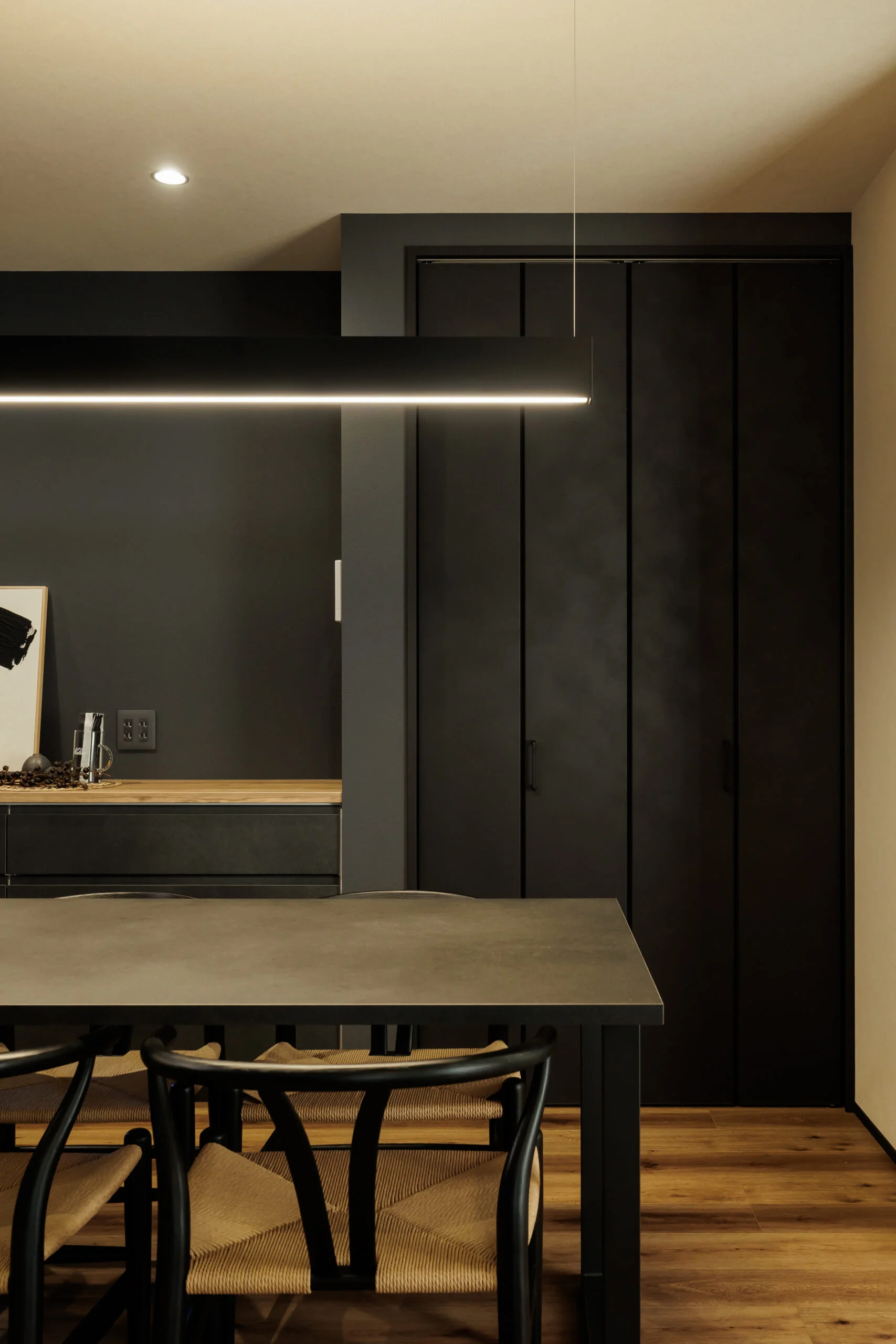 キッチンは照明や収納扉、家具をブラックで統一。ダイニングを一直線に配置することで、配膳や片付けもスムーズに行えます。パントリーも備え、見た目と使い勝手を両立しました。