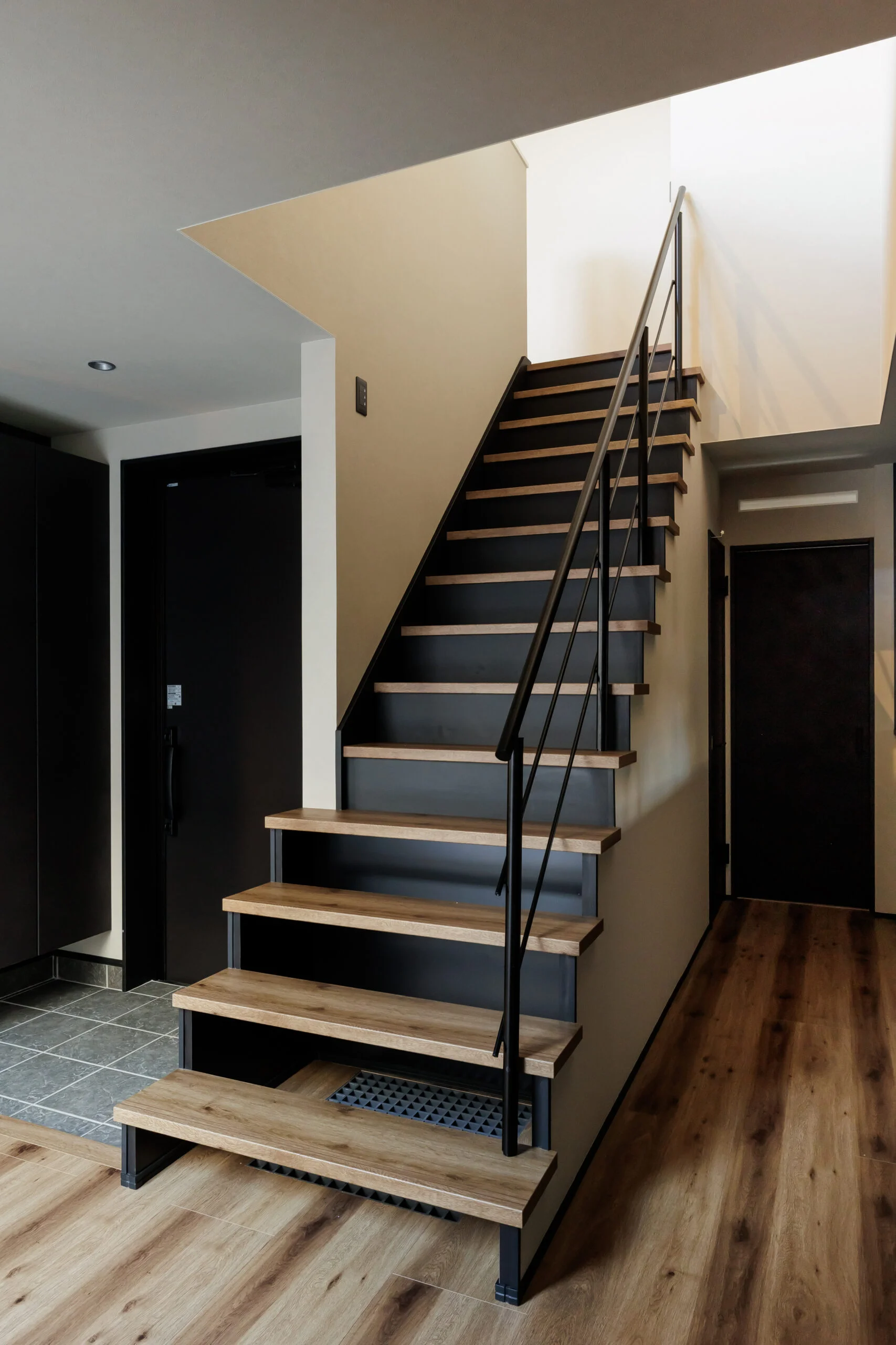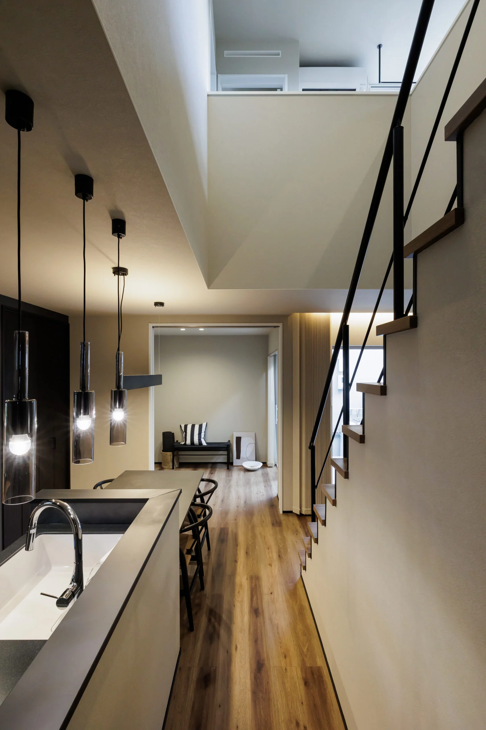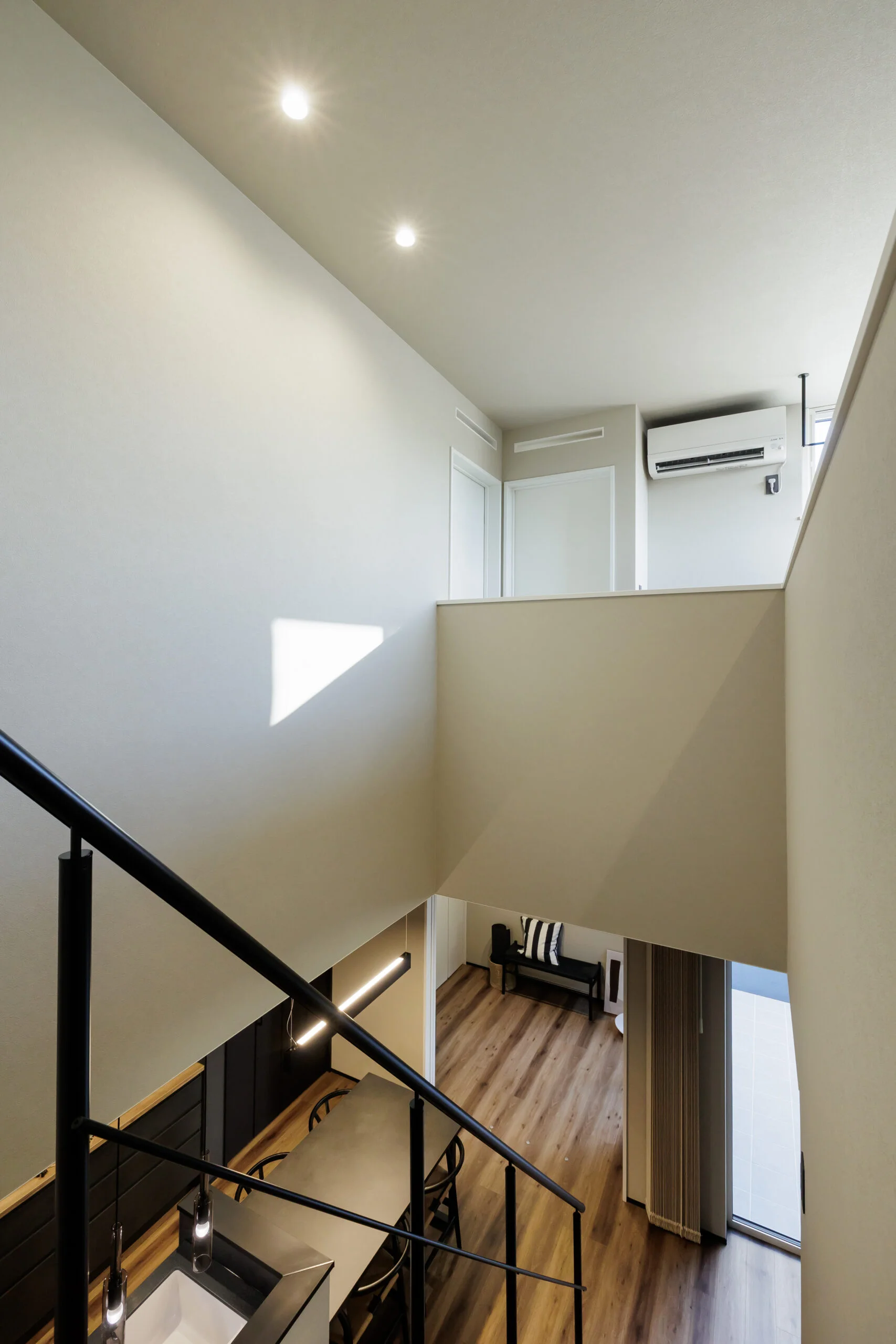 吹き抜けのような抜け感をつくる鉄骨階段が、LDKをさらに開放的に。