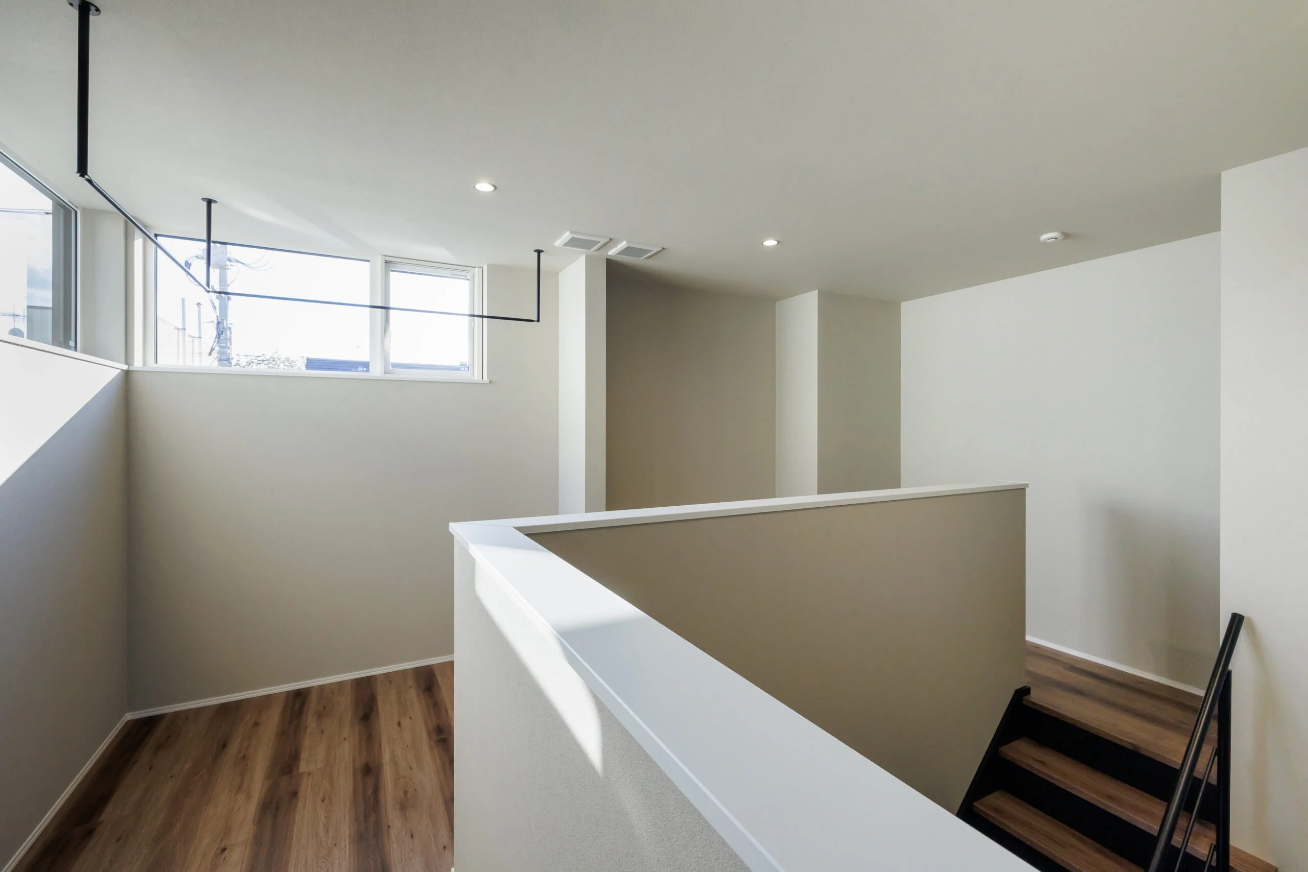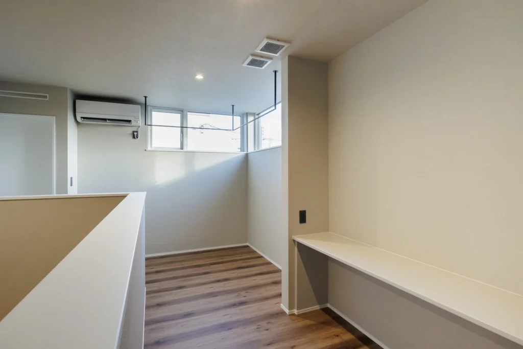 2階のホールに設けたカウンターは、テレワークや学習スペースに最適。高窓からの光が心地よく、ハンガーパイプも備え、物干しも気持ちよく行える使い勝手の良い一角です。