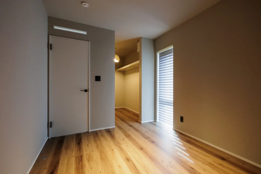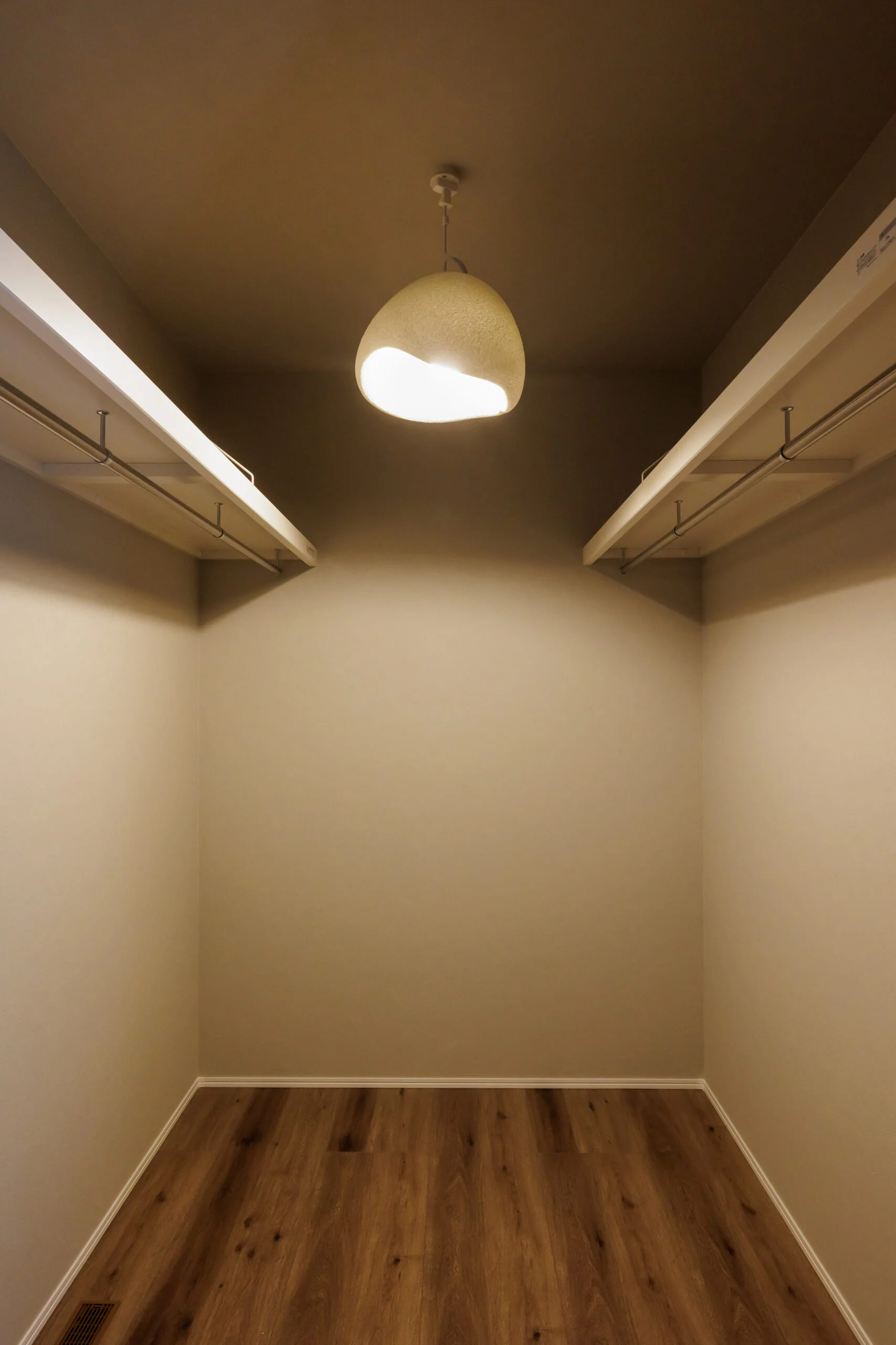 寝室のウォークインクローゼットは天井まで開口を設け、すっきりとした抜け感のある仕上がりに。