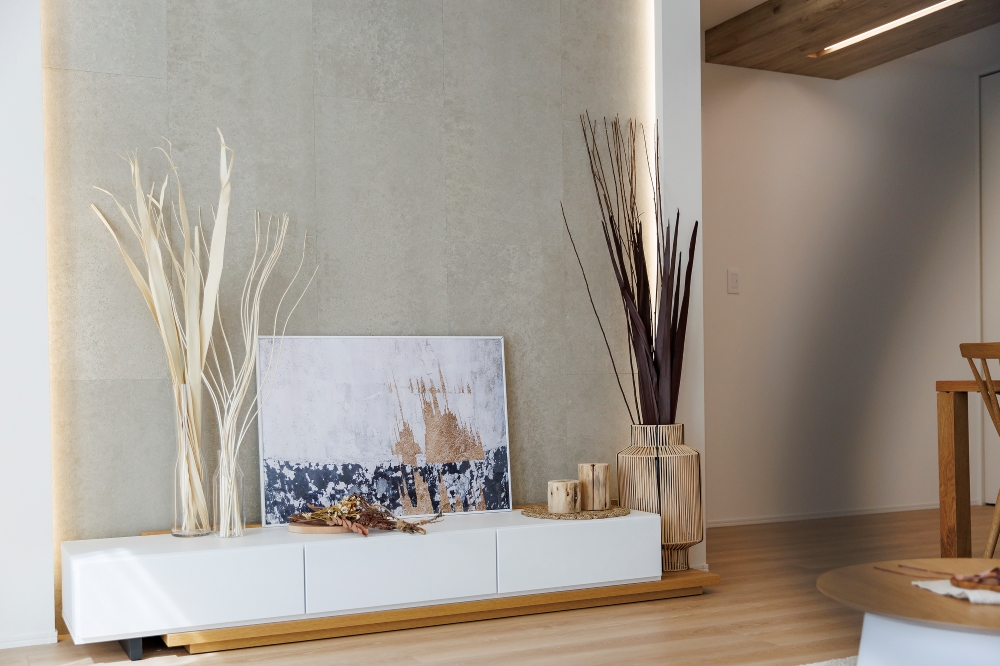 また、間接照明と組み合わせることで、クロスの素材感が際立ち、ホテルのような高級感あふれる空間を演出できます。テレビボードやスピーカーなどのAV機器とも調和しやすい、シンプルで上質なデザインがおすすめです。