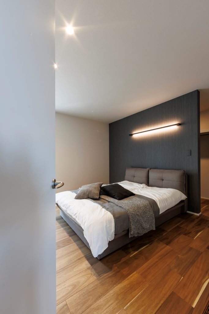 少し暗めのトーンの色をベッドヘッド側の壁に使うと、眠りにつきやすい落ち着いた空間になります。天井に暗い色を使うと、洞窟のような「おこもり感」が出て、これもまた安眠効果が期待できます。