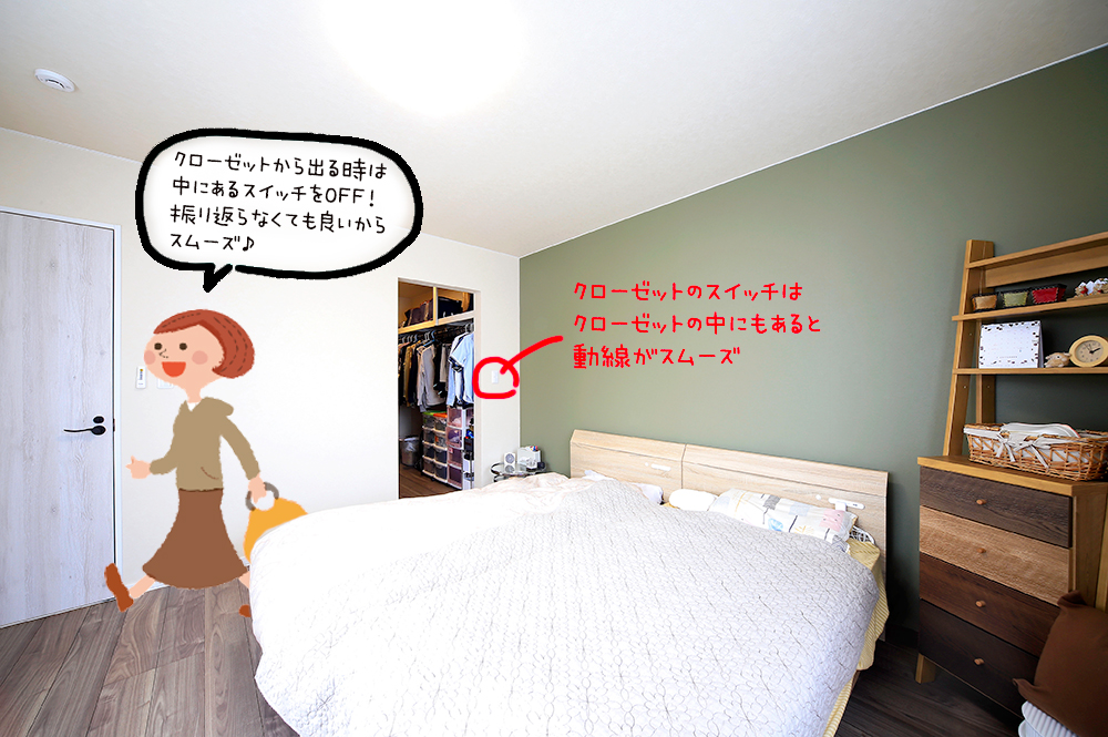 T様 私も照明スイッチで後悔しているものがあります。寝室にあるウォークインクローゼットの照明スイッチなんですけど。寝室側の壁にしか付けていないので、ウォークインクローゼットから出るとき、振り向いて消さないといけないんですよ。ほんとーにちょっとした事、なんですけど、毎日となると、やっぱり気になって。ウォークインタイプの収納の照明スイッチは出入口の外側と内側にそれぞれ付けると動線がスムーズですよ!って、これから家を建てる方に教えたいです。