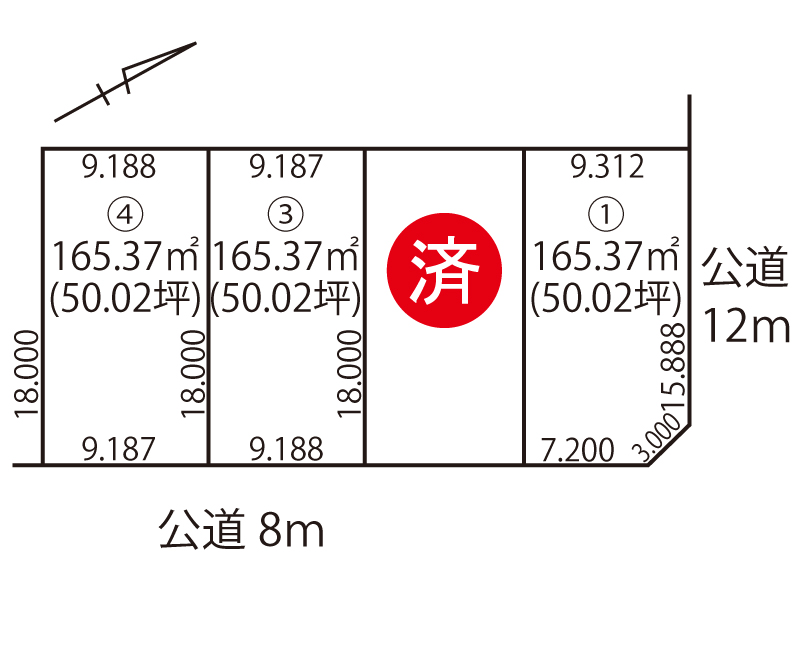 備考 ①②号地:一種住居/③号地:一種中高・一種住居/ ④号地:一種中高 北東側道路の中心線より30mまでが第1種住居地域、以降が第1種中高層住居専用地域となります。