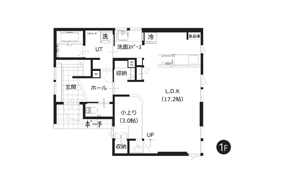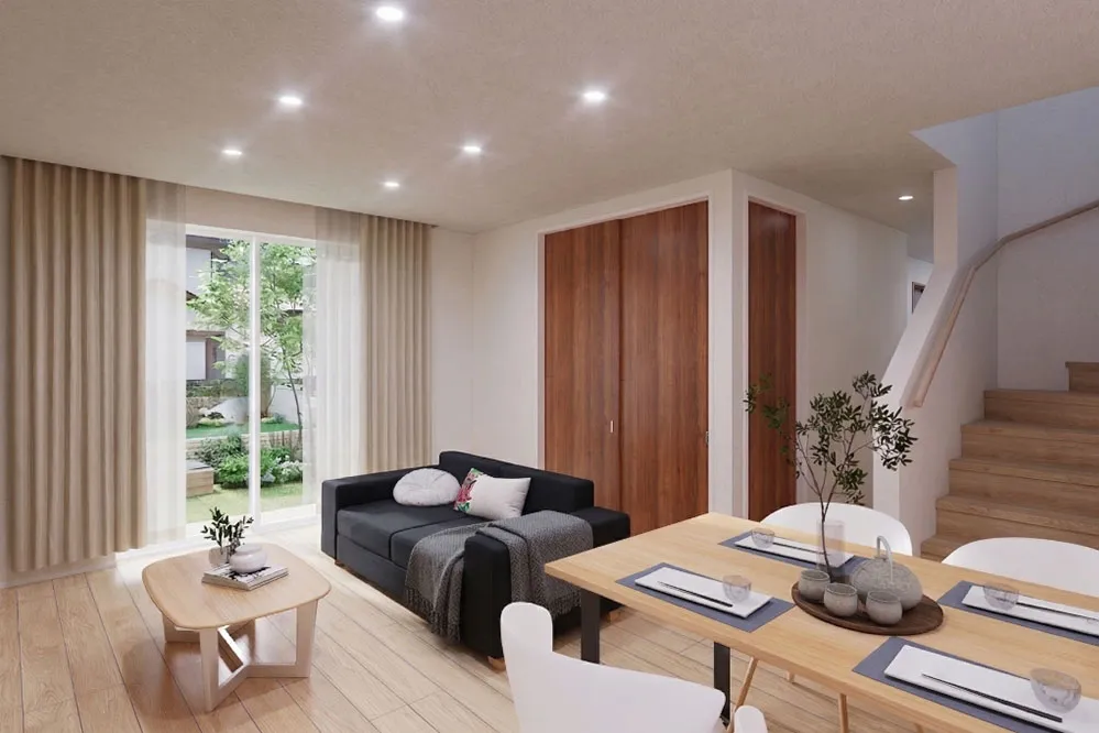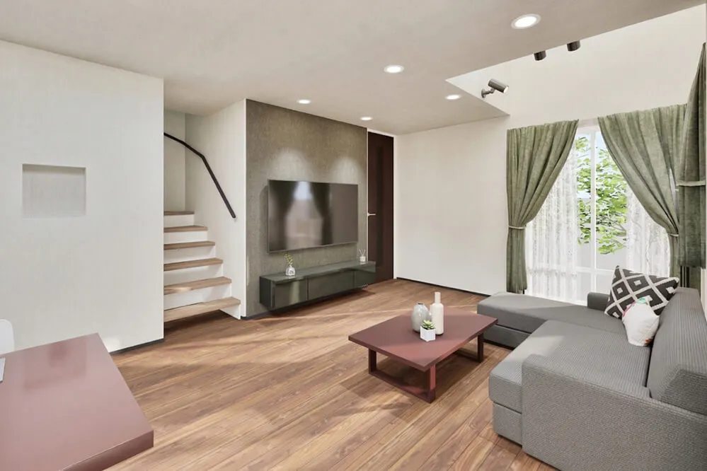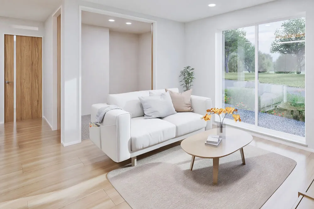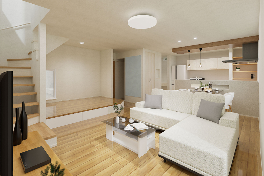 白を基調とした明るい住まいで、リビングに設けた小上がりが、毎日の暮らしにくつろぎと心地よさを生み出します。効率的な家事動線と暮らしやすさを追求した設計が、長く愛せる住まいです。