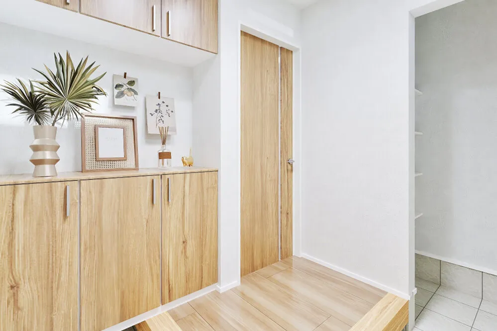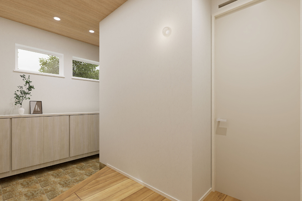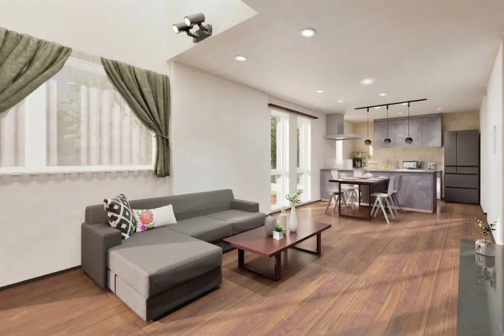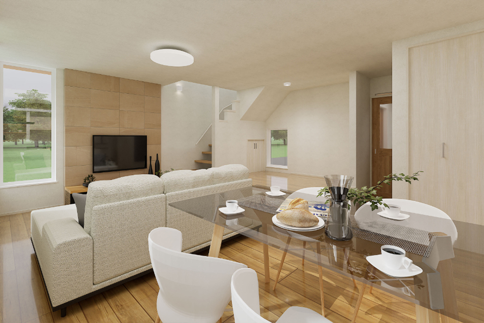 柔らかな木目×グレーで統一したインテリア。最大の特徴は、リビングと一体で楽しめる玄関土間です。大きな吹抜けがつくりだす心地よさを、ぜひご体感ください。