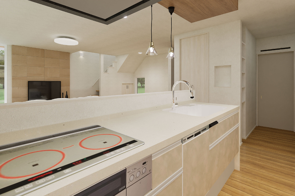 広々としたリビングの中心に、三角たれ壁が特徴の秘密基地のようなヌックを設計。空間のアクセントとして楽しめるデザインです。さらに、広々としたキッチン背面収納やファミリークローゼット・土間収納など、家族みんなが快適に暮らせる"ちょうど良い広さと収納"を実現しました。