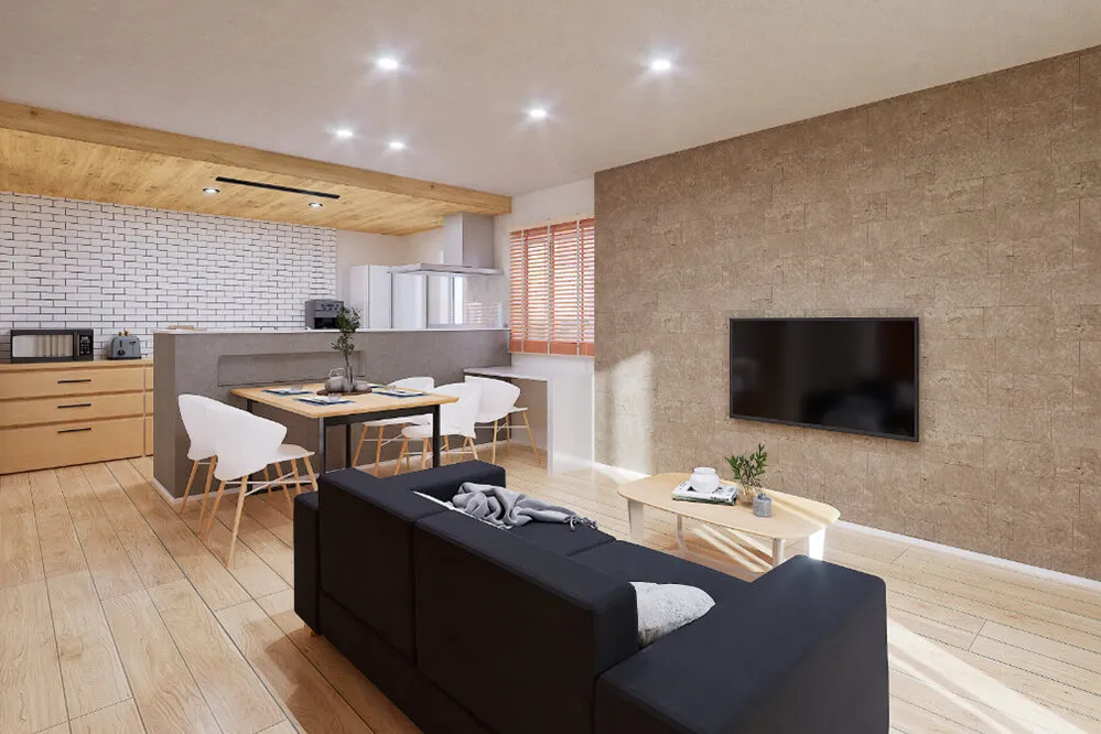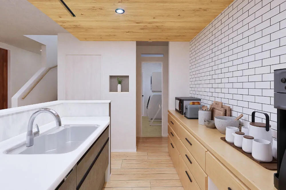 木の温もりと石目の質感が調和するLDKに、白タイルが映えるキッチン。リビングに設けたカウンタースペースや、回遊できる動線・適材適所の収納など、暮らしやすさと心地よさを両立した住まいです。ぜひご体感ください。