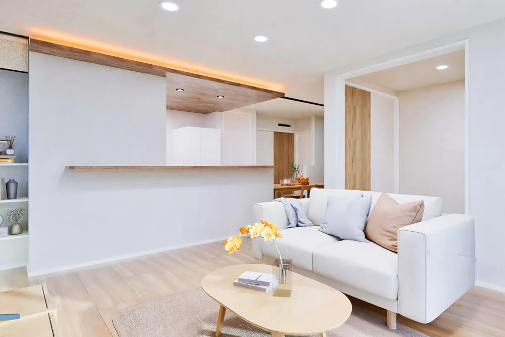 間接照明が映えるナチュラルモダンなLDKに、和室続きのリビングが広がりをプラス。プライベート感のあるバルコニーも備え、内と外で心地よく過ごせる住まいです。ぜひご体感ください。