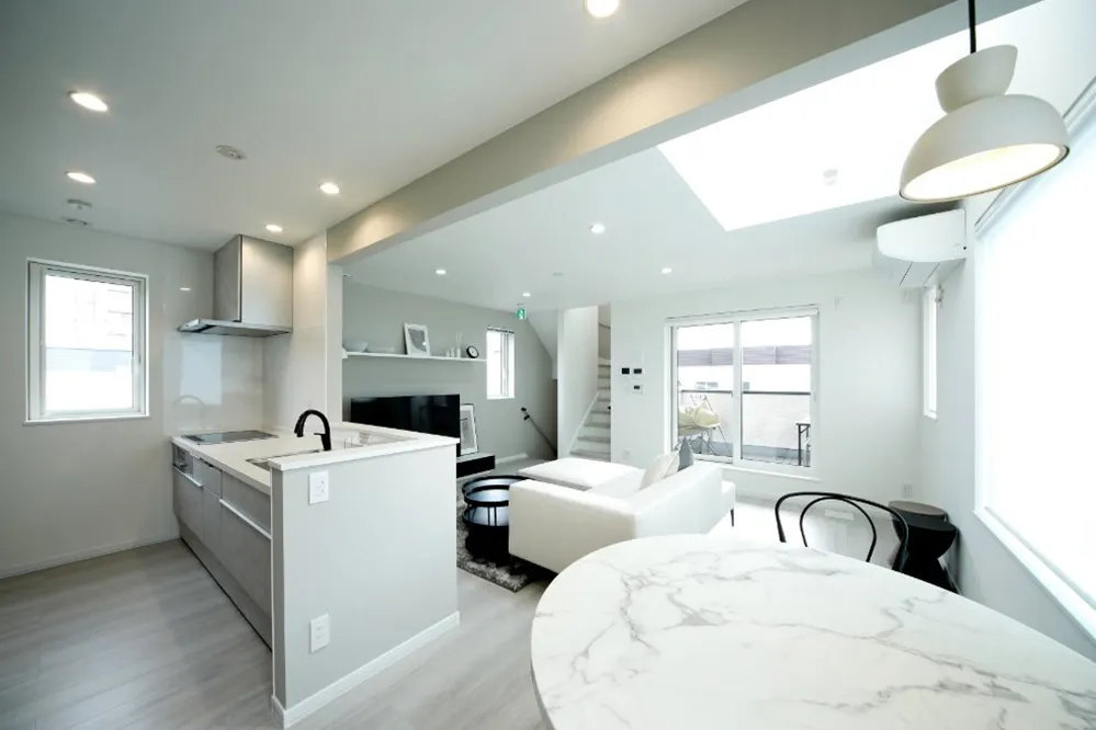 都市の限られた敷地に、家族のゆとりを描いた3階建ての住まい。 2階をまるごとLDKとし、吹き抜けからの光が家中を包みます。 リビングとつながるバルコニーで、外との一体感と心地よい時間を楽しめます。