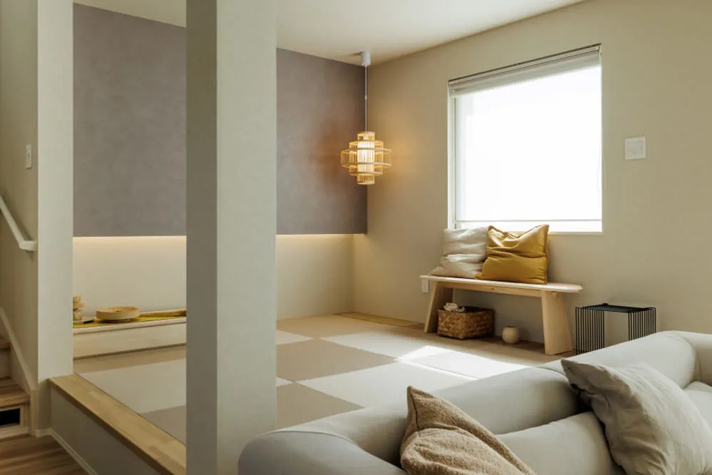 白を基調とした明るい住まいで、リビングに設けた小上がりが、毎日の暮らしにくつろぎと心地よさを生み出します。効率的な家事動線と暮らしやすさを追求した設計が、長く愛せる住まいです。