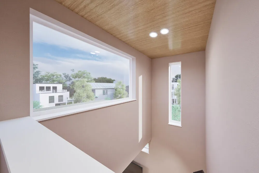 「空と緑を絵画のように切り取る、吹き抜けの大きな窓。」※設備仕様のイメージ写真です。実際の建物とは異なります。