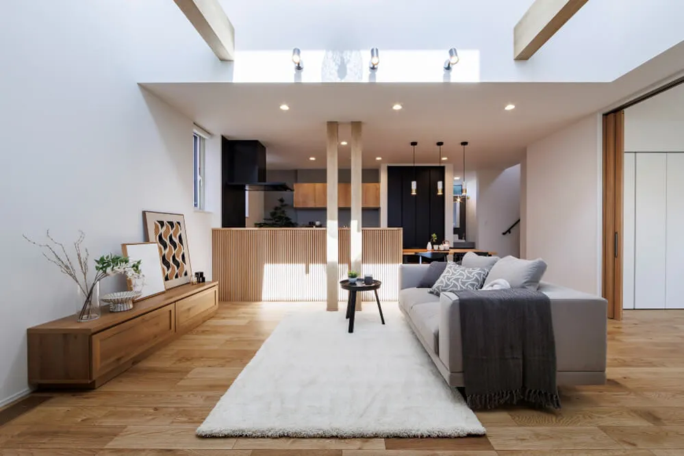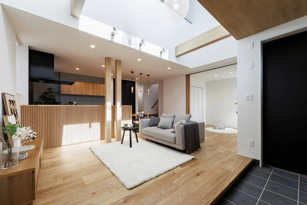 柔らかな木目×グレーで統一したインテリア。最大の特徴は、リビングと一体で楽しめる玄関土間です。大きな吹抜けがつくりだす心地よさを、ぜひご体感ください。