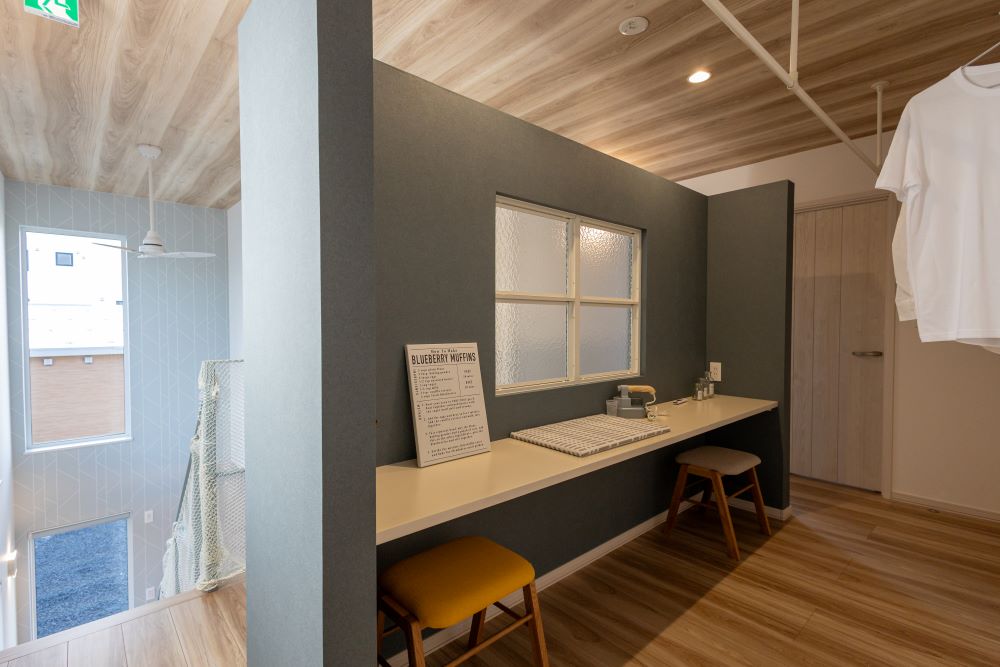 2階のホールには、家族みんなが使いやすいカウンタースペースを設置しました。5帖の広さがあり、仕事や趣味のスペースとしてはもちろん、室内干しが快適にできる工夫も施されています。
