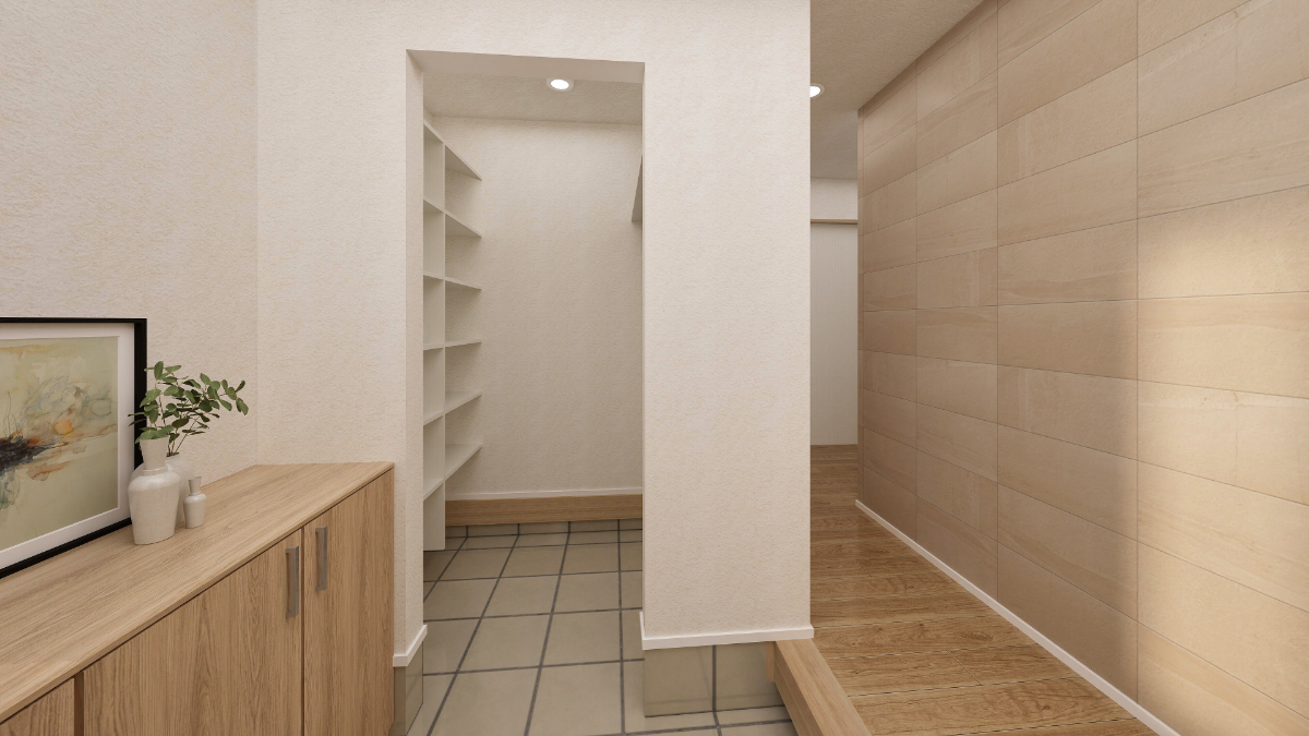 ベージュの大判タイル調クロスがやわらかな印象を与える玄関。土間続きのシューズクロークには靴やアウトドア用品をすっきり収納でき、いつも清潔で快適な玄関空間を保てます。