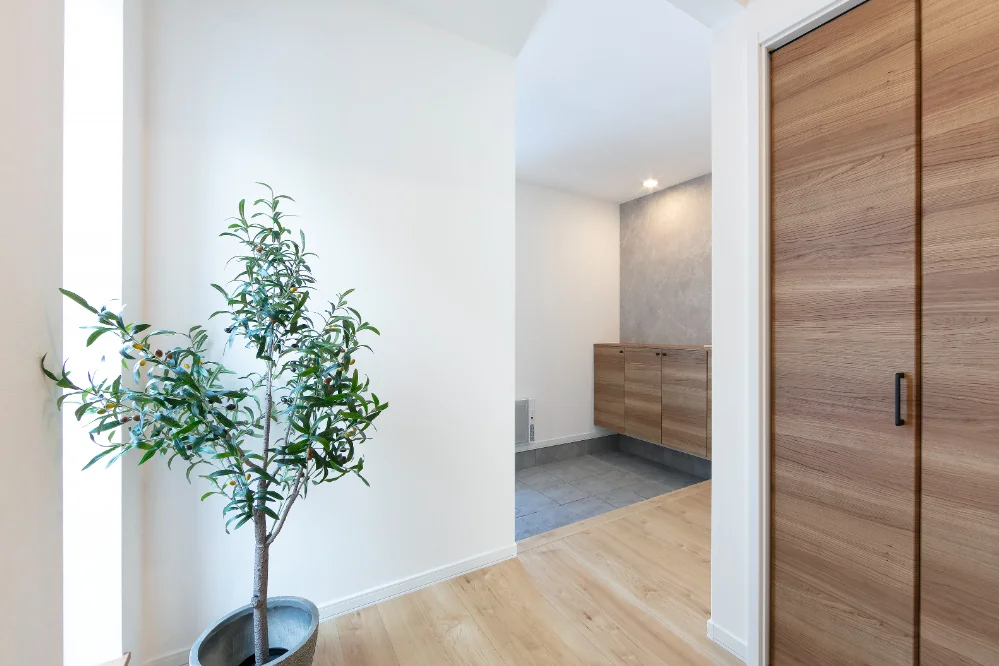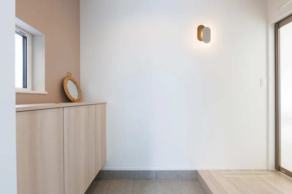 すっきりとしたデザインの玄関収納で、散らかりがちな足元もいつもきれいに。間接照明の柔らかな光が、明るく安心感のある空間を演出します。訪れる人を心地よく迎え入れる、洗練された住まい。