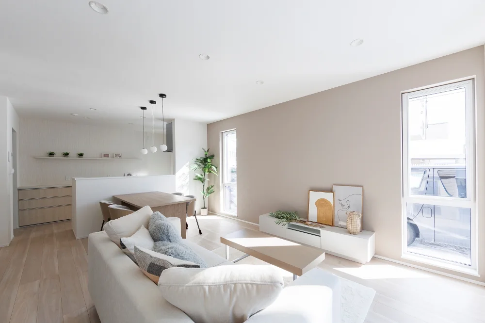 明るい木目と柔らかなトーンで統一された空間は、まるでカフェのような居心地の良さ。ダイニングキッチンが一体となった開放的な設計は、家族のコミュニケーションを自然に育みます。新生活に心地よい彩りを添える住まいです。