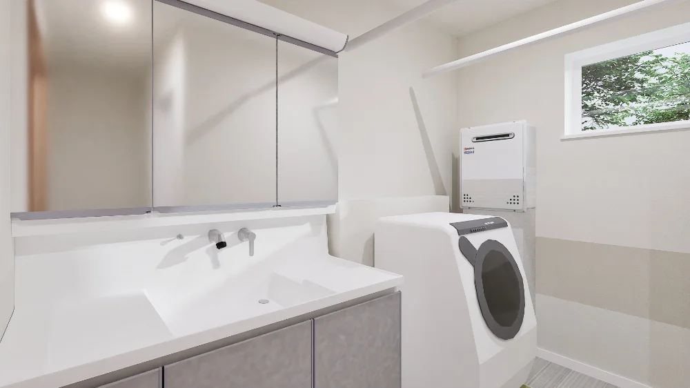 白とグレーでまとめた、ホテルライクなサニタリー空間。ゆとりのあるワイド洗面は、二人並んでも快適に身支度ができ、忙しい朝にも余裕をもたらします。ランドリーまで統一感のある設えとし、すっきりとした美しさを保ちます。